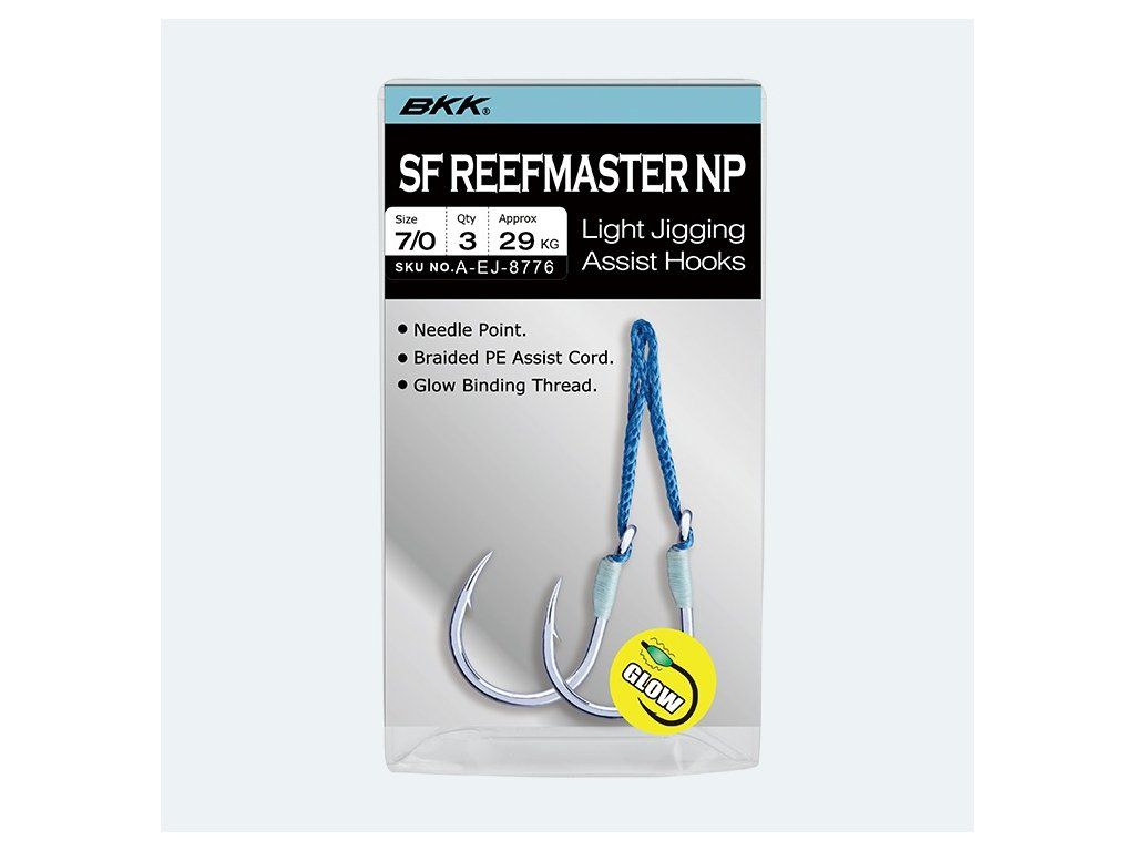 Koncept jigovacích assist háčků BKK SF Reef Master NP je vyvinut tak, aby rybáři měli k dispozici produkt, který mohou použít okamžitě po vybalení z krabičky. To vše s vysokým poměrem cena/výkon. Tyto assist hooky jsou navázané na vysoce kvalitní šnůře z 16 vláken, které jsou spleteny tak, aby měly požadovanou sílu a ohebnost. Svítící korálek na háčku povzbuzuje atraktivitu nástrahy a zvyšuje počet záběrů i ve snížených světelných podmínkách. Samotný háček v sobě má nejpokročilejší BKK technologie včetně Hand Ground hrotu háčku, speciálního kroužku a na povrchu háčku je nereznoucí lesklé cínové potažení.Doplňkové parametry