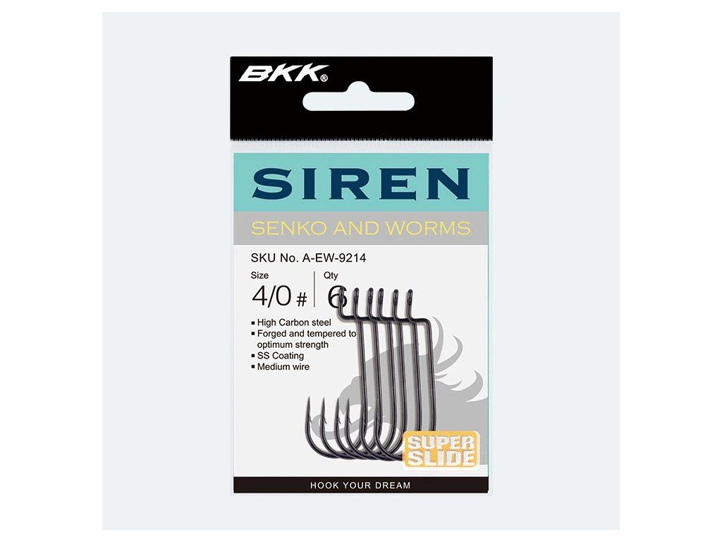 BKK Siren je háček na gumové červy speciálně vyvinutý pro návazce typu Texas, například na červy curly tail. Kombinace povrchové úpravy Super Slide a hrotu háčku ostrého jako jehla je již standartní kombinací u háčků firmy BKK.Doplňkové parametry