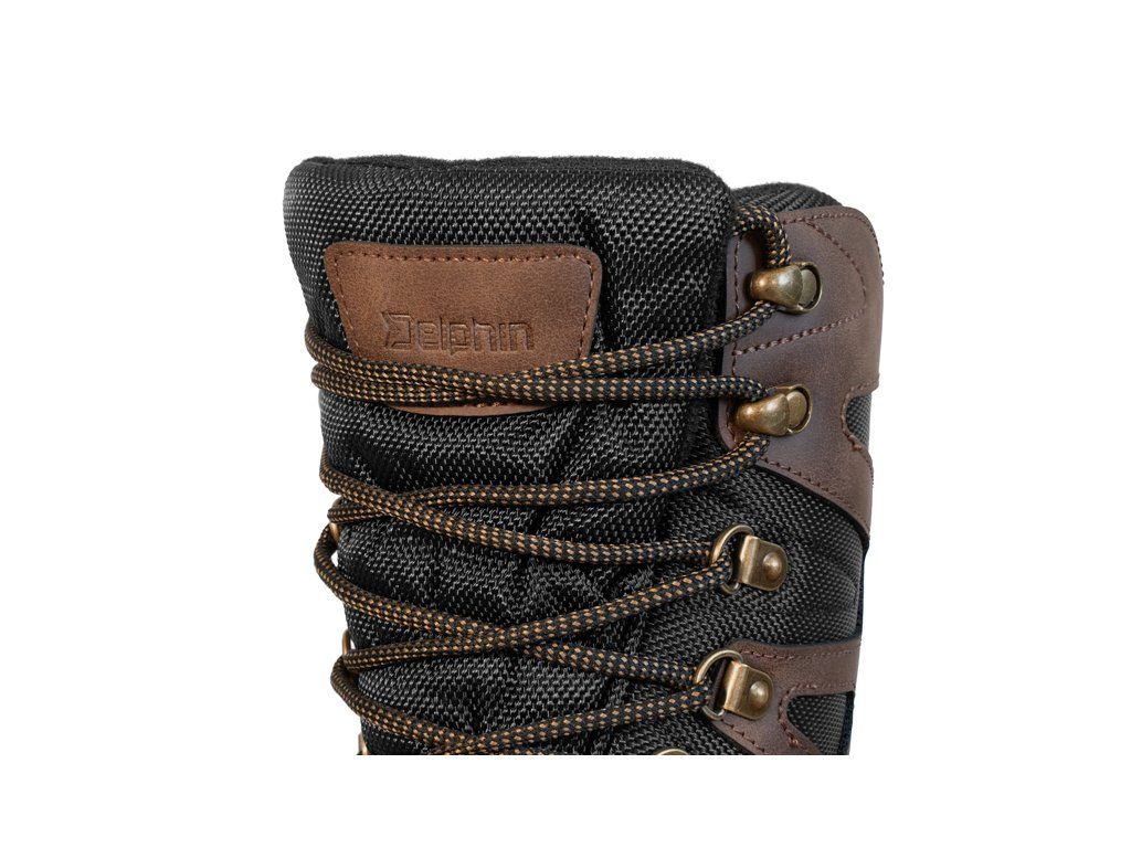 Během zimních měsíců je komfort u vody prioritou, právě proto jsme se rozhodli rozšířit zimní sortiment o obuv, která ochrání vaše nohy před chladem i vlhkostí. Vysoké boty Delphin ProTRAX jsou ideální volbou do nevyzpytatelných zimních podmínek, kdy se potřebujete spolehnout na každý krok. Při vývoji byly použity materiály s důrazem na maximální pohodlí. Spodní část je vyrobena z termoplastické gumy, což zaručuje nízkou hmotnost a dlouhou životnost bot. Zvýšený gumový lem sahá až pod kotníky a spolehlivě chrání vaše nohy před vlhkostí při chůzi přes louže, roztátý sníh či bláto. Gumová podrážka se navíc velmi snadno čistí a její protiskluzový vzor poskytuje stabilitu i na kluzkých površích. Vrchní část boty je vyhotovena z kombinace umělé kůže a síťoviny, která udrží vaše nohy v teple i při velmi nízkých teplotách. Ke zvýšení odolnosti vůči chladu přispívá kombinace fleecového materiálu a jemné umělé kožešiny uvnitř boty. Spojení těchto vlastností zajišťuje pohodlí i při vycházkách v extrémním počasí, například při lovu na dírkách, kde bota přichází do přímého kontaktu s ledem. Pohodlné nošení zajišťují kvalitní šňůrky provlečené přes kovová oka. Pro dokonalé zafixování nohou se ve vrchní části po stranách nacházejí čtyři kovové šněrovací háčky. Výška boty je navržena tak, aby poskytovala odolnost i při vydatné sněhové nadílce. Vrchní lem usnadňuje obouvání a umožňuje jej provést rychle a pohodlně. Hnědo-černé barevné provedení dokonale ladí nejen s rybářskými outfity, ale výborně se hodí i k mysliveckému či ostatnímu outdoorovému oblečení. Pokud chcete spolehlivou obuv, která spojuje teplo, pohodlí a odolnost i v extrémních podmínkách, Delphin ProTRAX jsou tou správnou volbou.Doplňkové parametry
