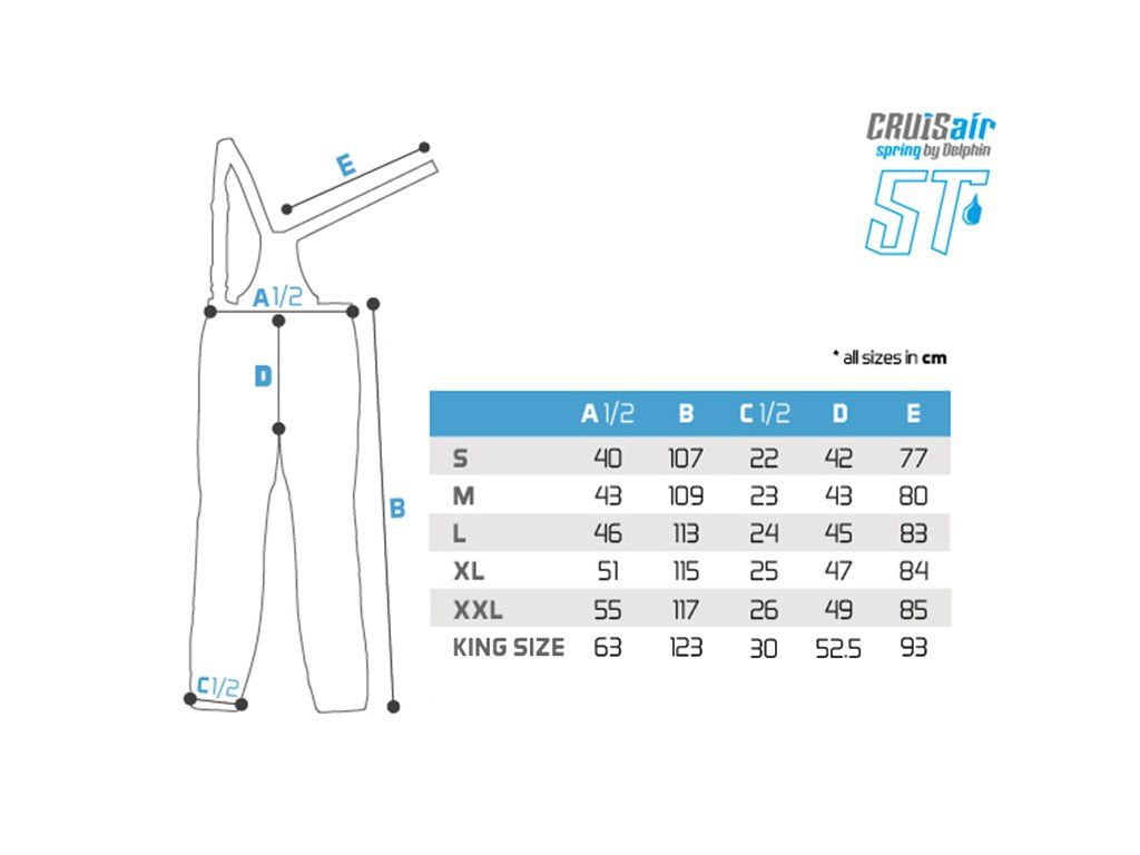 Dýchatelné svrchní oblečení nabízející excelentní ochranu vůči nepříznivým podmínkám, a to zejména dešti a větru. Delphin CruisAIR SPRING 5T je svými parametry vhodný zejména pro přechodné období jara a podzimu, kdy je počasí často nevyzpytatelné. Komplet CruisAIR SPRING 5T se skládá ze samostatně prodávané bundy a kalhot, což vám dává možnost nakombinovat si správnou velikost každého dílu. Nekompromisní kvalita použitých materiálů a odolnost vůči živlům perfektně charakterizují tento komplet. Nabízí vodní sloupec 5000mm ve spojení s paropropustností 3000g/m2/24h, díky čemuž vás nepřekvapí ani intenzivní liják, zůstanete v suchu a jen tak snadno se v něm nezpotíte. Bunda Vnitřní strana bundy je opatřena síťovinovou látkou, která zamezuje dotyku kůže s vnějším materiálem. Kromě toho je na dotek velmi příjemná, čímž zvyšuje pohodlí během nošení. Uvnitř je i velmi praktická zipovatelná kapsa, vhodná například na doklady, či jiné cennosti. Dvě kapsy se nacházejí i na vnější straně bundy, přičemž disponují voděodolnými zipy, díky čemuž nehrozí zatečení vody dovnitř. Zapínání bundy je zajištěno pomocí odolného zipu, který je překryt pásem tkaniny se suchými zipy. Rukávy jsou na zápěstí regulovatelné pomocí popruhů se suchým zipem a tedy je možné si je pořádně utáhnout a minimalizovat vtékání vody po rukou. Ve spodní části bundy se nacházejí po bocích gumičky umožňující zatáhnutí a přizpůsobení dle vašich potřeb. Nejvíce namáhané části jsou překryty černou tkaninou odolnou vůči poškození a fyzickému zatížení. Samozřejmostí na bundě je kapuce, stahovatelná dvěma gumičkami. Kapuci je navíc možné odepnout pomocí zipu a bundu tak využívat i bez ní. Kalhoty Jednou z hlavních výhod kalhot je vyvýšený pas v oblasti křížů, čímž bude spodní část vašich zad dokonale chráněna. V oblasti hýždí a kolen se nachází zesílená černá látka, jejímž úkolem je ochrana před znehodnocením, těchto používáním nejvíce náchylných částí kalhot. Elastické kšandy se zapínáním na klipy zaručí, že kalhoty budou dobře sedět a nebudou vám padat. Zapínání pasu je provedeno z kvalitního zipu a 2 kovových cvoků, nechybí ani poutka po obvodu sloužící pro použití pásku. Ve spodní části lze kalhoty regulovat pomocí krytého zipu a zatahovacího pásu se suchým zipem. Při praní doporučujeme použít speciální prací prostředek na funkční oblečení, prát při max. 30°C, neždímat, nežehlit a v případě potřeby použít impregnační přípravek, který obnoví vodoodpudivou úpravu vnějšího materiálu.Doplňkové parametry