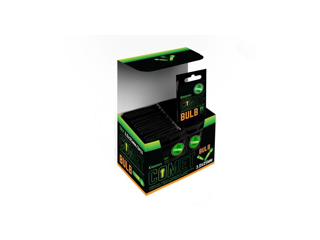 Chemické světlo Comet BULB je vynikajícím pomocníkem při večerním a nočním lovu. Díky svému tvaru "žárovky" je ideální na osvětlení například splávku, na který se dá Comet BULB upevnit pomocí gumové trubičky. Manipulace s tímto světlem je velmi jednoduchá. Zlomením žluté části uvnitř dojde k chemické reakci, která způsobí svícení této tyčinky. Pro rovnoměrné svícení doporučujeme po zlomení tyčinkou párkrát zatřást. Světlo je dostupné ve dvou velikostech. Díky pokrokové technologii je doba svícení až 8 hodin!Doplňkové parametry