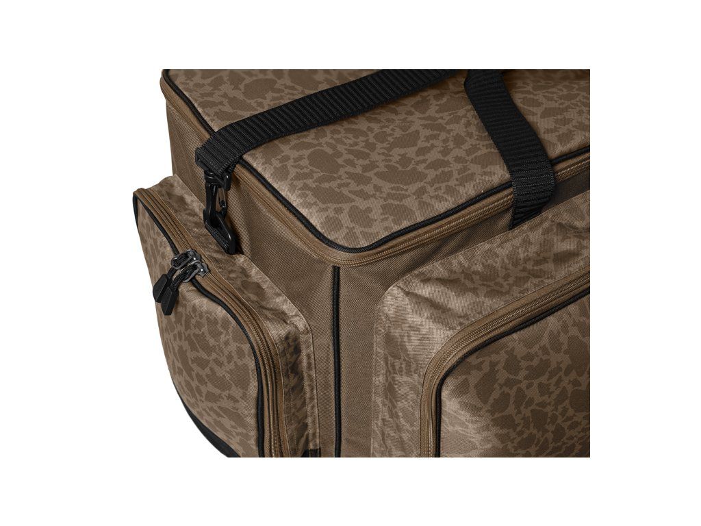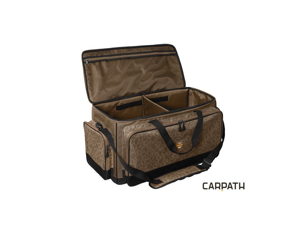 Delphin Area CARRY Carpath 3XL je praktická taška, která slouží pro uložení rybářského příslušenství. Navržena byla s důrazem na praktičnost, trvanlivost a odolnost vůči nepříznivým povětrnostním vlivům. Taška je ze všech stran osazena 6mm polstrováním pro maximální ochranu vašeho příslušenství uvnitř. Uvnitř se nachází také vyjímatelná a nastavitelná středová příčka na suchý zip, která je dokonce i polstrovaná a můžete díky ní oddělit všechno to, co by se mohlo nějakým způsobem poškodit uvnitř tašky. Celá taška je mimořádně kompaktní a stabilní, i když je úplně prázdná. Celá spodní část tašky je osazena vyztuženou, 5 cm vysokou, nepromokavou vrstvou, která dovoluje položení tašky na mokrý povrch. To ještě více přispívá k tomu, že taška je také na spodní straně mimořádně stabilní a drží si svůj tvar. Na obou stranách se nacházejí dvě objemné kapsy. Vepředu se nachází jedna menší dvoukapsa. Uvnitř najdete ještě jednu velkou síťovou kapsu. Samotný vnitřek je navržen tak, abyste do něj s lehkostí ukládali další tašky série AREA. Maximální komfort dotváří mimořádně měkké polstrování popruhu pro zavěšení na rameno, či praktické rukojeti umožňující nošení tašky v ruce. Taška je vybavena kvalitními zipy. Vnější zipy jsou vybaveny plastovými taháčky, které jsou na koncích rozšířené, a proto je můžete rychle uchopit. Design tašky doplňuje naše jedinečná hnědá Carpath kamufláž se siluetami kaprů. Technické parametry: Rozměr tašky: 80x40x35cm Čistý rozměr vnitřního prostoru: 70x31x34cm Rozměr přední kapsa: 60x30x5cm Rozměr boční kapsy: 35x25x5cm Vnitřní síťovaná kapsa: 63x29cm Objem: 90l Kamufláž CARPATH je unikátním a patentovaným designovým vzorem, který v sobě skloubil maskovací vizuál kamufláže a siluety kaprů, které tuto kamufláž tvoří. Tento jedinečný a neopakovatelný návrh pochází kompletně z dílny značky Delphin a posouvá hranice vašeho rybářského vybavení do zcela nové dimenze.Doplňkové parametry