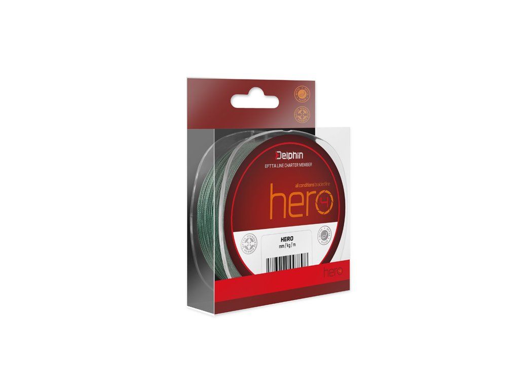 ".... 4 vláknová šňůra za cenu monofilu..." Delphin HERO je spolehlivá šňůra pletená ze 4 PE mikrovláken. Systematickým pletením vláken je dosažena výborná nosnost šňůry a téměř nulová průtažnost. Záběr se tak okamžitě přenáší z nástrahy do rybářského prutu, což umožní reagovat daleko rychleji než při použití vlasce. Šnůra je povrchově upravená, čímž je eliminovaná její nasákavost. Díky široké škále nabízených průměrů a nosností je Delphin HERO velmi vhodná pro použití na většinu rybolovných technik!Doplňkové parametry