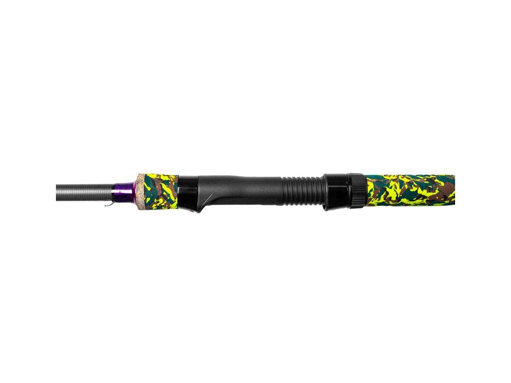 Zhypnotizujte všechny velké dravce! Pruty pro všechny, kterým nic neříkají zažité konvence. Na první pohled upoutá rukojeť, která je tvořena barevnou kamufláží s použitím barev zářivá zelená, hnědá a zelená. Nad touto "hypnotickou" rukojetí najdeme decentní korkové detaily a v celé spodní třetině prutu najdeme i fialové zdobení vyvázané nití. Matný šedý blank a černé vázání oček činí z tohoto prutu elegantního společníka u vody, zatímco moderně laděná spodní část okamžitě upoutá pozornost. Poloparabolická akce na tužším blanku činí z tohoto modelu velmi účinnou zbraň na velké dravce, které prut dokáže pohodlně vypružit v celé své délce a klidně zdolat i srdnaté štiky či menší sumce. Technické parametry: Model: 210cm / 60g Počet dílů: 2 Počet oček: 8 Průměr blanku nad rukojetí: 10mm Transportní délka: 110cm Hmotnost: 120g Rukojeť: EVA pěna a NEO-FOAM Délka rukojeti (od spodní části prutu po střed sedla): 33cm Model: 240cm / 60g Počet dílů: 2 Počet oček: 8 Průměr blanku nad rukojetí: 11mm Transportní délka: 125cm Hmotnost: 150g Rukojeť: EVA pěna a NEO-FOAM Délka rukojeti (od spodní části prutu po střed sedla): 36cm Model: 260cm / 60g Počet dílů: 2 Počet oček: 9 Průměr blanku nad rukojetí: 11mm Transportní délka: 135cm Hmotnost: 164g Rukojeť: EVA pěna a NEO-FOAM Délka rukojeti (od spodní části prutu po střed sedla): 37cm Model: 300cm / 60g Počet dílů: 2 Počet oček: 8 Průměr blanku nad rukojetí: 17mm Transportní délka: 155cm Hmotnost: 200g Rukojeť: EVA pěna a NEO-FOAM Délka rukojeti (od spodní části prutu po střed sedla): 39cmDoplňkové parametry