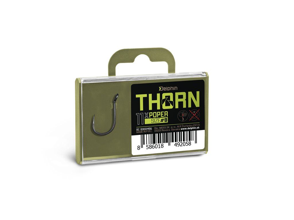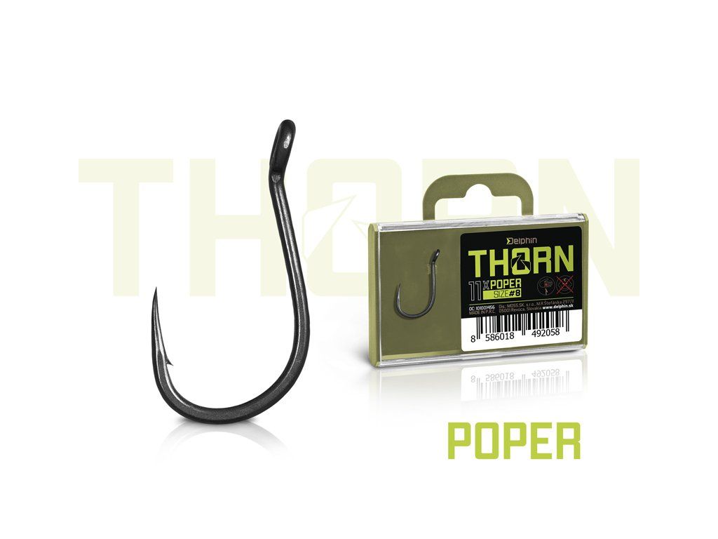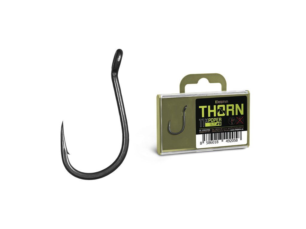 Delphin THORN je prémiová řada kaprařských háčků nejvyšší kvality. Díky moderním technologiím, které byly použity při výrobě jsou tyto háčky synonymem nekompromisní pevnosti a maximální ostrosti. Háčky ze série THORN disponují titanX povrchovou úpravou, čímž nabývají matný šedý povrch, který je navíc dokonale hladký pro snadné proniknutí do kapří tlamy. TitanX se stará také o zpevnění a odolnost celého háčku. Pomocí aplikované technologie Ultrapoint 4.8, bylo možné vytvořit delší hrot, který poskytuje přímo neuvěřitelnou ostrost. Háčky Delphin THORN jsou balené v praktické krabičce, ve které bude jejich ostří vždy důkladně chráněné. Na krabičce se navíc nachází držák s očkem pro zavěšení do prodejen, který lze snadno odstranit odlomením bez jakéhokoli nástroje díky čemuž krabička ve vaší výbavě zabere podstatně méně místa. THORN Poper je háček specifický očkem vyhnutým do vnější strany. Takové provedení ho předurčuje především pro použití s pop-up nástrahami. Výborně se hodí na tvorbu montáží jako Chod rig, Multi rig, Zig rig a podobně. Díky mírnému zakřivení hrotu dovnitř bude po záseku dokonale sedět v kapří tlamě. Technický parametr: háček osově rovnýDoplňkové parametry