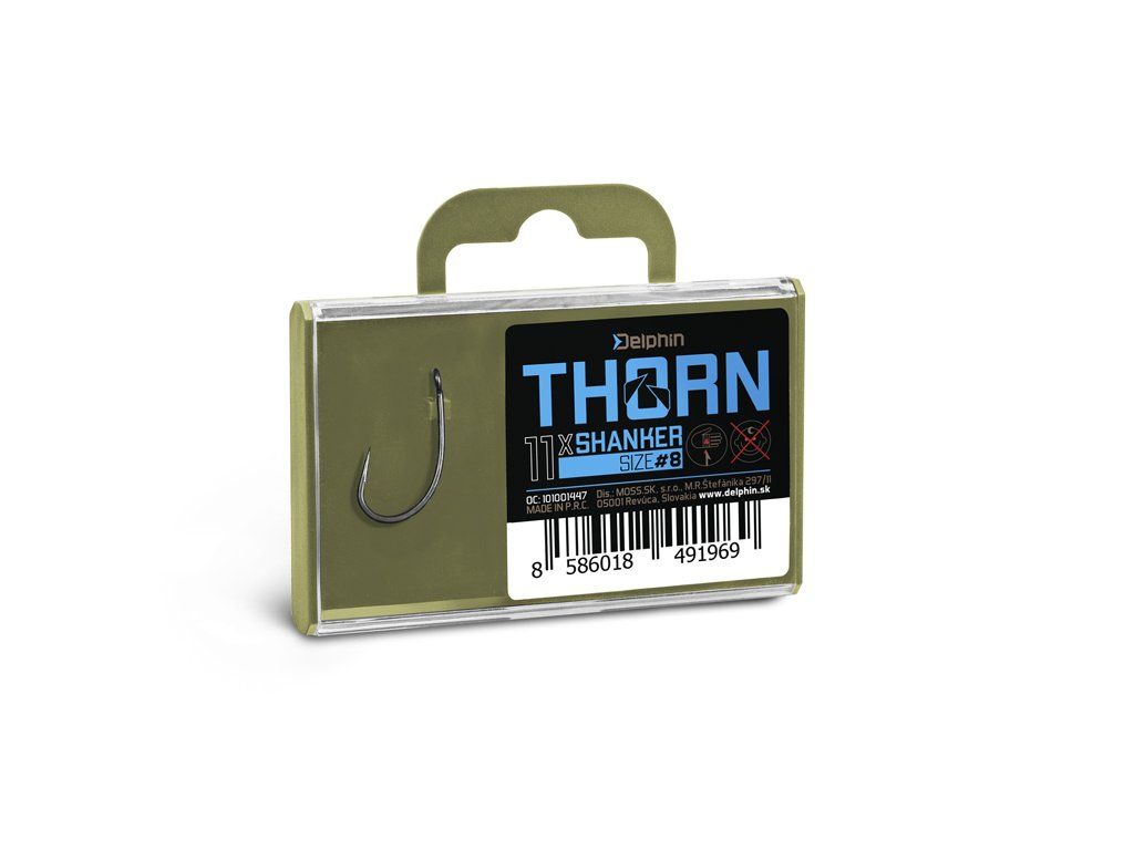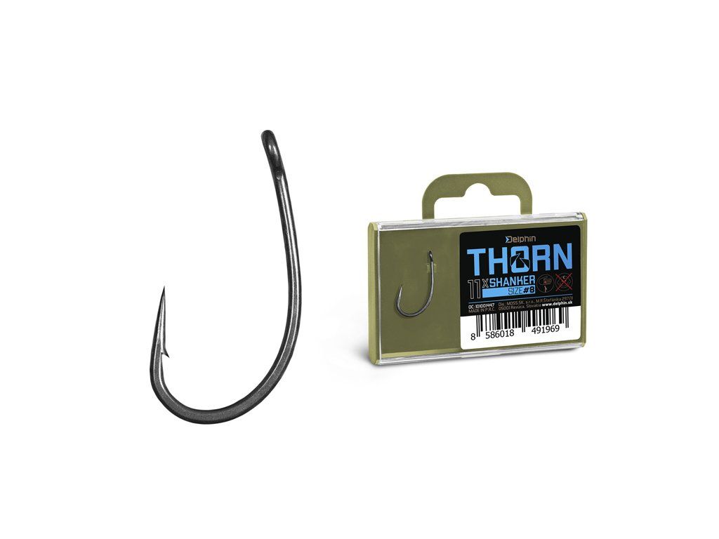 Delphin THORN je prémiová řada kaprařských háčků nejvyšší kvality. Díky moderním technologiím, které byly použity při výrobě jsou tyto háčky synonymem nekompromisní pevnosti a maximální ostrosti. Háčky ze série THORN disponují titanX povrchovou úpravou, čímž nabývají matný šedý povrch, který je navíc dokonale hladký pro snadné proniknutí do kapří tlamy. TitanX se stará také o zpevnění a odolnost celého háčku. Pomocí aplikované technologie Ultrapoint 4.8, bylo možné vytvořit delší hrot, který poskytuje přímo neuvěřitelnou ostrost. Háčky Delphin THORN jsou balené v praktické krabičce, ve které bude jejich ostří vždy důkladně chráněné. Na krabičce se navíc nachází držák s očkem pro zavěšení do prodejen, který lze snadno odstranit odlomením bez jakéhokoli nástroje díky čemuž krabička ve vaší výbavě zabere podstatně méně místa. THORN Shanker je díky svému tvaru typickým zástupcem háčků z kategorie curved shank. Háček s takovým zakřivením je doslova zasekávací mašinou a při správně navázané montáži se Shanker, si můžete být jisti, že ztrátovost ryb se bude blížit k nule. Ideálně se hodí pro lov s potápivými nástrahami, ale také ho lze použít při chytání s pop-up. Technický parametr: háček osově rovnýDoplňkové parametry