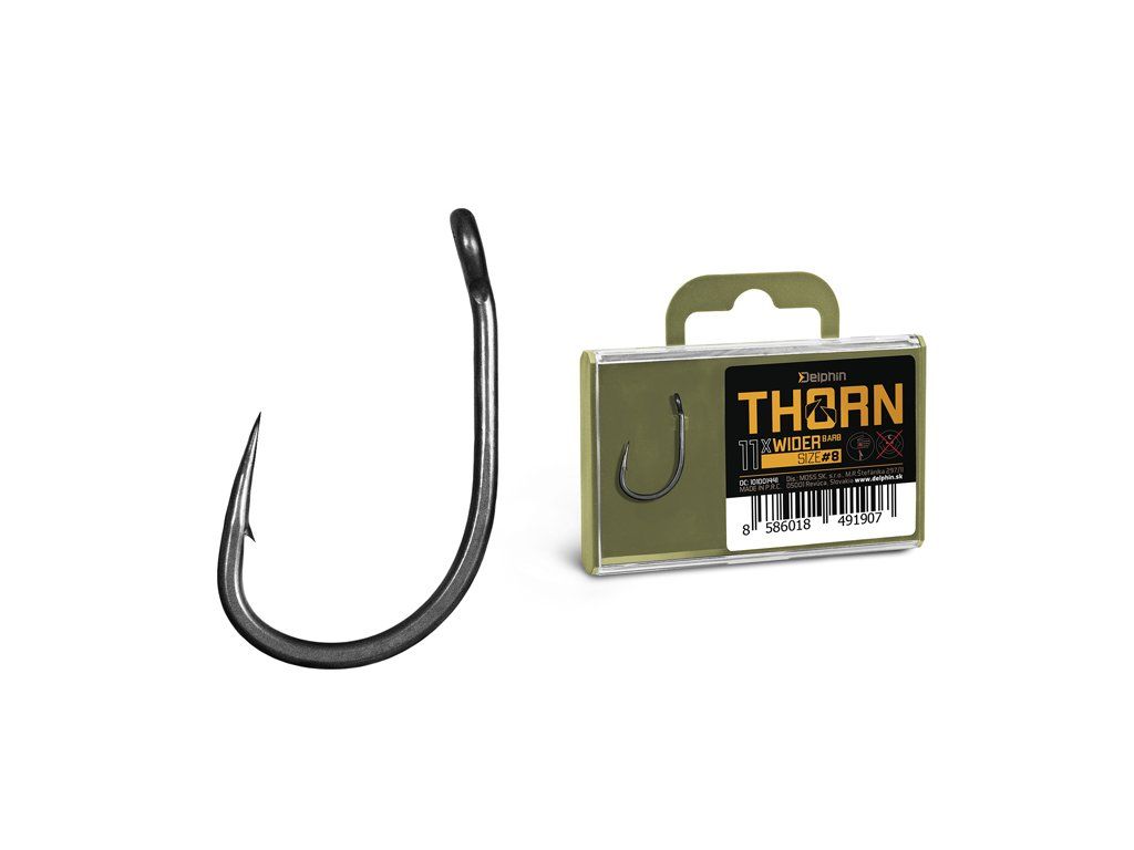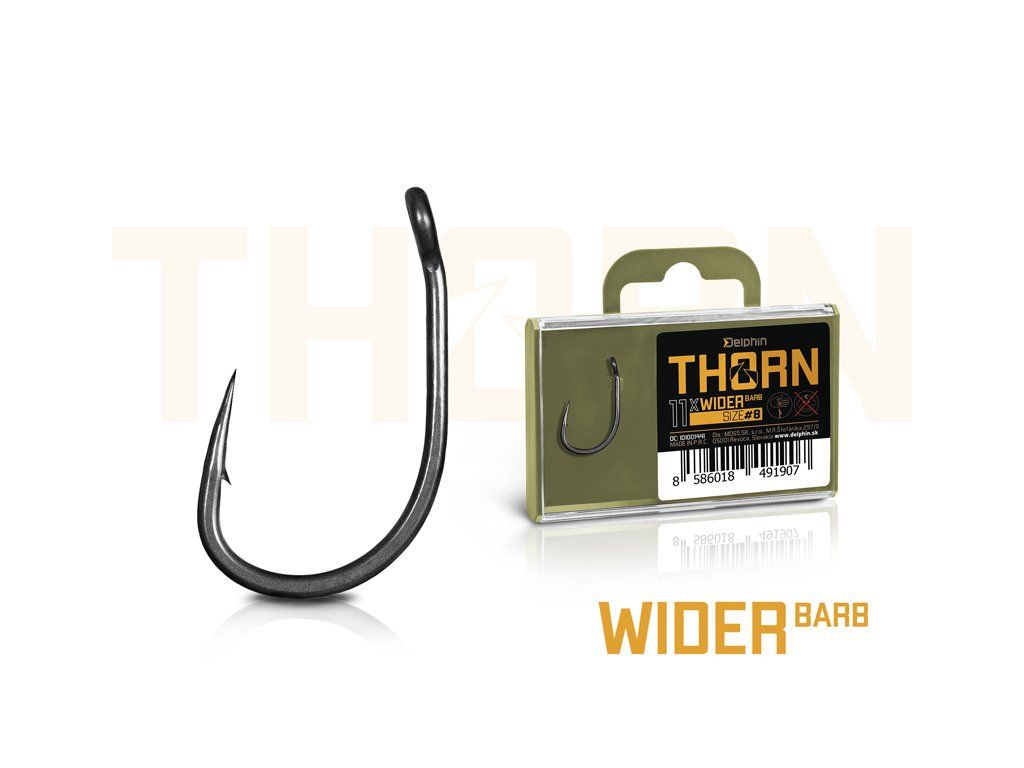 Delphin THORN je prémiová řada kaprařských háčků nejvyšší kvality. Díky moderním technologiím, které byly použity při výrobě jsou tyto háčky synonymem nekompromisní pevnosti a maximální ostrosti. Háčky ze série THORN disponují titanX povrchovou úpravou, čímž nabývají matný šedý povrch, který je navíc dokonale hladký pro snadné proniknutí do kapří tlamy. TitanX se stará také o zpevnění a odolnost celého háčku. Pomocí aplikované technologie Ultrapoint 4.8, bylo možné vytvořit delší hrot, který poskytuje přímo neuvěřitelnou ostrost. Háčky Delphin THORN jsou balené v praktické krabičce, ve které bude jejich ostří vždy důkladně chráněné. Na krabičce se navíc nachází držák s očkem pro zavěšení do prodejen, který lze snadno odstranit odlomením bez jakéhokoli nástroje díky čemuž krabička ve vaší výbavě zabere podstatně méně místa. THORN Wider je specifický svým přímo již legendárním tvarem typu wide gape. Jde o háček charakteristický širším obloukem a rovným ramínkem. Díky těmto parametrům jde o velmi univerzální a spolehlivý háček, který je možné využít při různých návazcích a nástrahách. Technický parametr: háček osově rovnýDoplňkové parametry