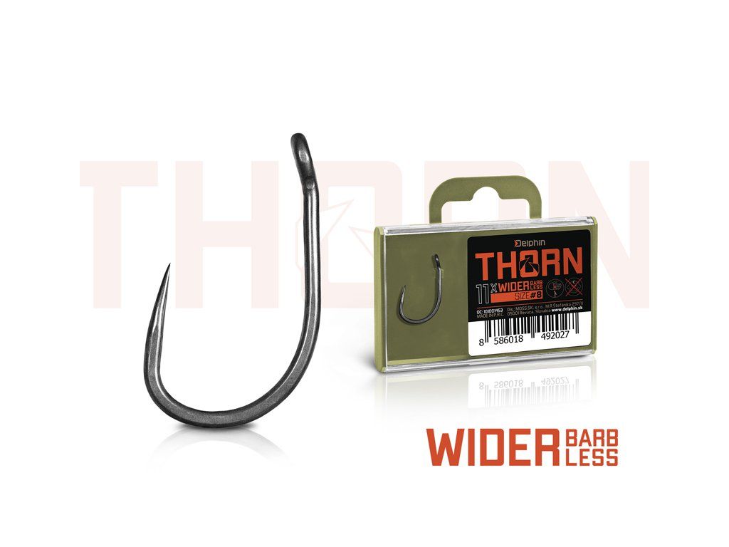Delphin THORN je prémiová řada kaprařských háčků nejvyšší kvality. Díky moderním technologiím, které byly použity při výrobě jsou tyto háčky synonymem nekompromisní pevnosti a maximální ostrosti. Háčky ze série THORN disponují titanX povrchovou úpravou, čímž nabývají matný šedý povrch, který je navíc dokonale hladký pro snadné proniknutí do kapří tlamy. TitanX se stará také o zpevnění a odolnost celého háčku. Pomocí aplikované technologie Ultrapoint 4.8, bylo možné vytvořit delší hrot, který poskytuje přímo neuvěřitelnou ostrost. Háčky Delphin THORN jsou balené v praktické krabičce, ve které bude jejich ostří vždy důkladně chráněné. Na krabičce se navíc nachází držák s očkem pro zavěšení do prodejen, který lze snadno odstranit odlomením bez jakéhokoli nástroje díky čemuž krabička ve vaší výbavě zabere podstatně méně místa. THORN Wider BarbLESS je specifický svým přímo již legendárním tvarem typu wide gape. Jde o háček charakteristický širším obloukem a rovným ramínkem. Díky těmto parametrům jde o velmi univerzální a spolehlivý háček, který je možné využít při různých návazcích a nástrahách. V tomto případě háček nedisponuje protihrotem, díky čemuž pronikne do kapří tlamy mnohem snadněji. Technický parametr: háček osově rovnýDoplňkové parametry