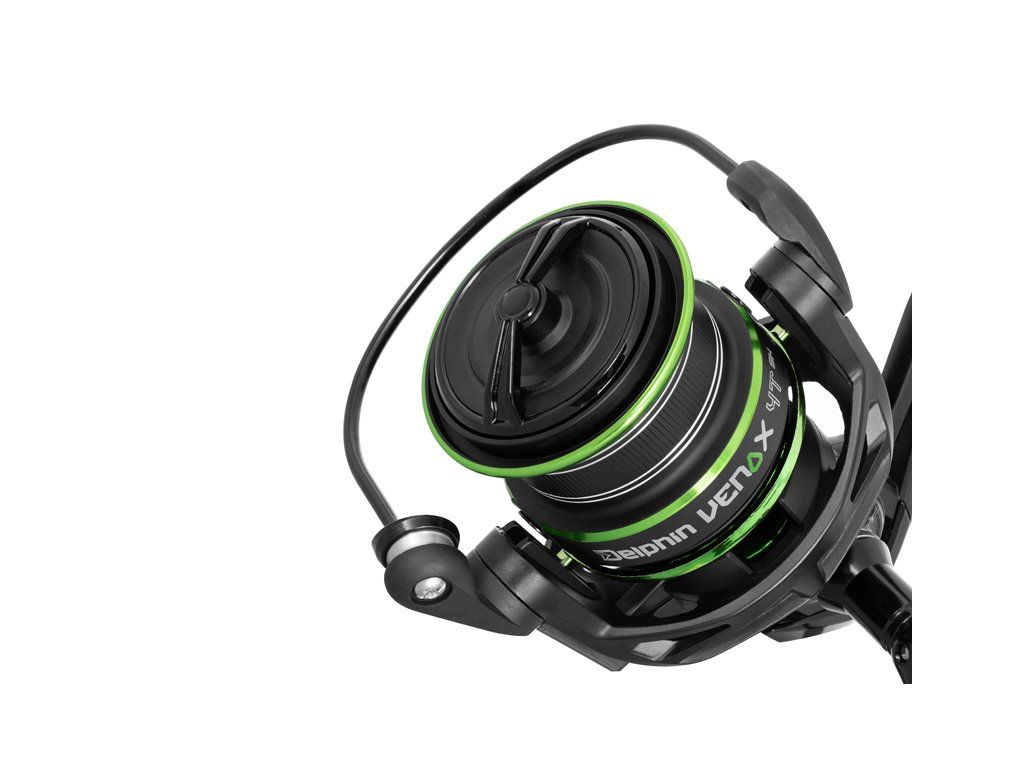 Delphin VENOX je ideálním navijákem pro příznivce lovu na feeder, hledající vynikající výkon za skvělou cenu. Když si vezmete tento naviják do ruky, budete mít doslova pocit jako byste lovili s navijákem ze zcela jiné třídy. Naviják disponuje až sedmi kuličkovými ložisky (6+1) a tím pádem mají všechny namáhané části dostatečnou sílu a pracují efektivněji. Převodový poměr 5.1:1 při menších velikostech a 5.5:1 při velikosti 6000 zajišťují optimální návin vlasce při častém přehazování a stahování montáží. Černá kovová cívka se zelenými detaily je široká a mělká, čímž perfektně vyhovuje požadavkům feederové techniky a není zapotřebí navíjet si na ni kilometry vlasce nízkého průměru. Po obou stranách se nacházejí kvalitní černé kovové klipy pro zachycení vlasce. Pod cívkou se nachází lesklá zelená ochrana proti sklouznutí vlasce, která brání nechtěnému zamotávání. Brzda navijáku je dostatečně citlivá, čímž je ideální pro používání s jemnými feederovými pruty. Pevný kovový překlápěč a rolnička vylepšují odolnost a životnost VENOXu. Štíhlá kovová černá klika je zakončena ergonomicky tvarovaným gumovým madlem s karbonovou úpravou, které se příjemně drží v ruce a vylepšuje požitek z navíjení. Tělo navijáku je laděno do černé barvy s efektními výřezy na více místech a doplňky s karbonovým efektem. Technické parametry: Delphin VENOX 4T SH | vel.4000 Kapacita navijáku mm/m: 0.20/230m, 0.22/190m, 0.25/145m Převodový poměr: 5.1:1 Počet ložisek: 6+1 Hmotnost: 282g Delphin VENOX 4.5T SH | vel.4500 Kapacita navijáku mm/m: 0.20/248m, 0.22/205m, 0.25/159m Převodový poměr: 5.1:1 Počet ložisek: 6+1 Hmotnost: 290g Delphin VENOX 5T SH | vel.5000 Kapacita navijáku mm/m: 0.22/226m, 0.25/175m, 0.28/140m Převodový poměr: 5.1:1 Počet ložisek: 6+1 Hmotnost: 303g Delphin VENOX 6T SH | vel.6000 Kapacita navijáku mm/m: 0.25/223m, 0.28/178m, 0.30/155m Převodový poměr: 5.5:1 Počet ložisek: 6+1 Hmotnost: 377gDoplňkové parametry