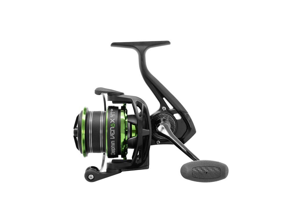 Delphin VENOX je ideálním navijákem pro příznivce lovu na feeder, hledající vynikající výkon za skvělou cenu. Když si vezmete tento naviják do ruky, budete mít doslova pocit jako byste lovili s navijákem ze zcela jiné třídy. Naviják disponuje až sedmi kuličkovými ložisky (6+1) a tím pádem mají všechny namáhané části dostatečnou sílu a pracují efektivněji. Převodový poměr 5.1:1 při menších velikostech a 5.5:1 při velikosti 6000 zajišťují optimální návin vlasce při častém přehazování a stahování montáží. Černá kovová cívka se zelenými detaily je široká a mělká, čímž perfektně vyhovuje požadavkům feederové techniky a není zapotřebí navíjet si na ni kilometry vlasce nízkého průměru. Po obou stranách se nacházejí kvalitní černé kovové klipy pro zachycení vlasce. Pod cívkou se nachází lesklá zelená ochrana proti sklouznutí vlasce, která brání nechtěnému zamotávání. Brzda navijáku je dostatečně citlivá, čímž je ideální pro používání s jemnými feederovými pruty. Pevný kovový překlápěč a rolnička vylepšují odolnost a životnost VENOXu. Štíhlá kovová černá klika je zakončena ergonomicky tvarovaným gumovým madlem s karbonovou úpravou, které se příjemně drží v ruce a vylepšuje požitek z navíjení. Tělo navijáku je laděno do černé barvy s efektními výřezy na více místech a doplňky s karbonovým efektem. Technické parametry: Delphin VENOX 4T SH | vel.4000 Kapacita navijáku mm/m: 0.20/230m, 0.22/190m, 0.25/145m Převodový poměr: 5.1:1 Počet ložisek: 6+1 Hmotnost: 282g Delphin VENOX 4.5T SH | vel.4500 Kapacita navijáku mm/m: 0.20/248m, 0.22/205m, 0.25/159m Převodový poměr: 5.1:1 Počet ložisek: 6+1 Hmotnost: 290g Delphin VENOX 5T SH | vel.5000 Kapacita navijáku mm/m: 0.22/226m, 0.25/175m, 0.28/140m Převodový poměr: 5.1:1 Počet ložisek: 6+1 Hmotnost: 303g Delphin VENOX 6T SH | vel.6000 Kapacita navijáku mm/m: 0.25/223m, 0.28/178m, 0.30/155m Převodový poměr: 5.5:1 Počet ložisek: 6+1 Hmotnost: 377gDoplňkové parametry