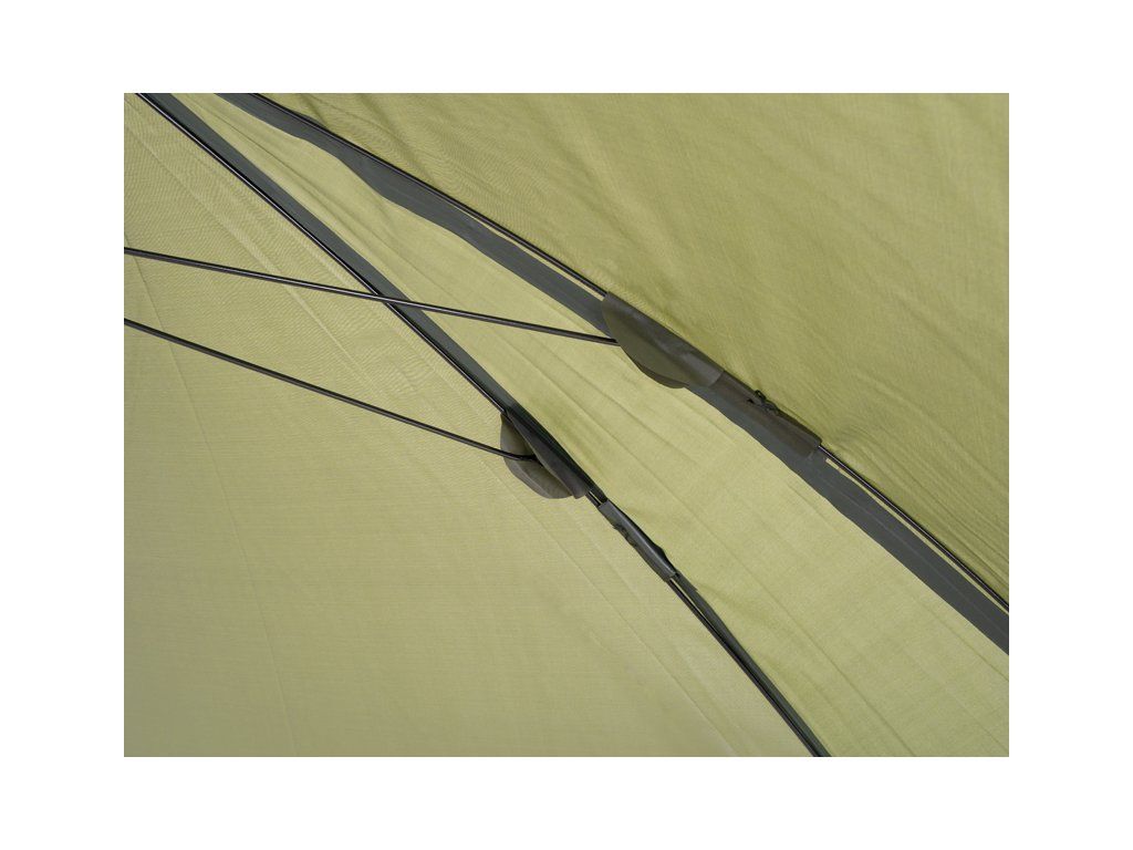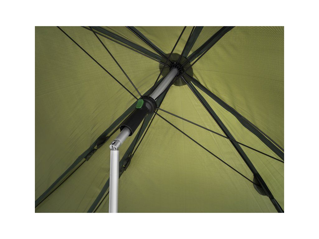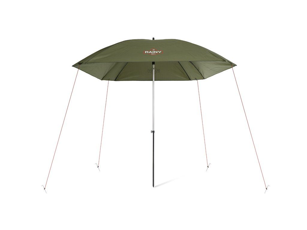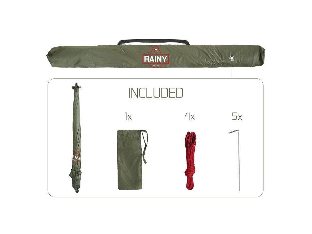 Deštník RAINY je přímo předurčen na situace, kdy se vypravíte k vodě na kratší dobu a nechcete, aby vás zaskočila nepřízeň počasí. Představuje výbornou ochranu před ostrými slunečními paprsky, rosou či srážkami. Jeho hlavními přednostmi jsou rychlost a jednoduchost rozložení či nízká hmotnost. Kromě toho se však vyznačuje specifickým hranatým tvarem kopule. Právě díky tomu deštník zakryje větší plochu v porovnání s klasickým deštníkem o stejném rozměru. Švy deštníku jsou důkladně podlepeny voděodolnou páskou pro zajištění 100% nepromokavosti i v případě silného deště. Výšku a sklon deštníku lze přizpůsobit podle potřeby, což zároveň usnadní jeho upevnění i v členitějším terénu. Technické parametry: Max.výška deštníku (až po vrch kopule): 215 cm Průměr přes kopuli: 250cmDoplňkové parametry