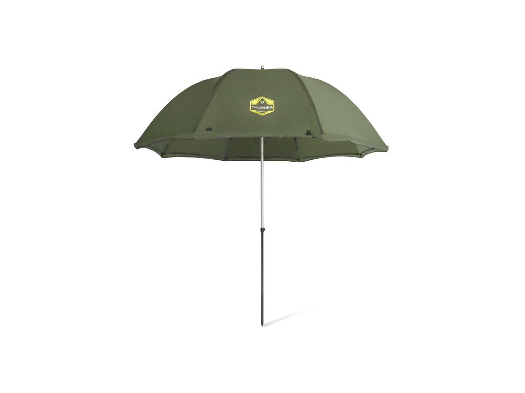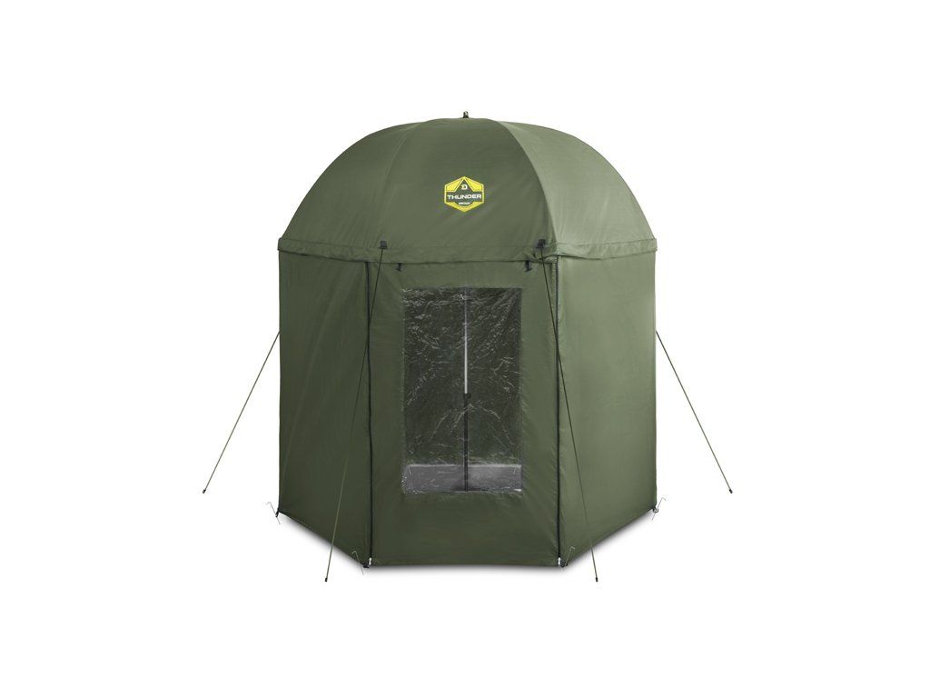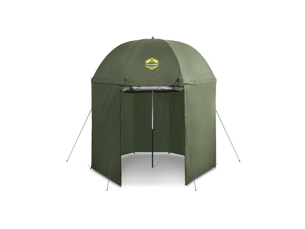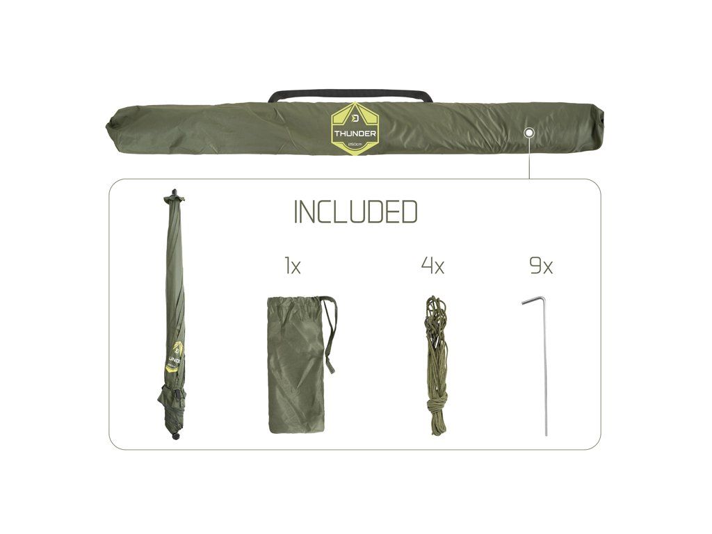 Deštník s kompletně uzavíratelnou bočnicí Delphin THUNDER FullWALL je ideální volbou do nepříznivého počasí během kratších výprav. Perfektně ochrání před nepříjemným sluncem, ranní rosou, ale i vyšším úhrnem srážek. Pro lepší stabilitu ve větru je opatřen čtyřmi ukotvovacími lany. Švy deštníku jsou důkladně podlepeny voděodolnou páskou pro zajištění 100% nepromokavosti i v případě silného deště. Díky boční prodloužené stěně po celém obvodu budete před nepříznivými podmínkami chráněni ze všech stran. Bočnice disponuje dveřmi, které jsou opatřeny kvalitními zipy. Kromě toho se na dveřích nachází průhledné plastové okno, díky kterému budete z deštníku vidět na pruty i za deště. Spodní část boční stěny je osazena úchyty pro připevnění k zemi pomocí zajišťovacích kolíků, které jsou součástí balení. Výšku a sklon deštníku lze přizpůsobit podle potřeby, což zároveň usnadní jeho upevnění i v členitějším terénu. Technické parametry: Max.výška deštníku (až po vrch kopule): 215cm Max. výška deštníku (s upevněnou boční stěnou): 200cm Průměr přes kopuli: 250cm Transportní rozměry: 135x12x12cm Hmotnost: 3kgDoplňkové parametry