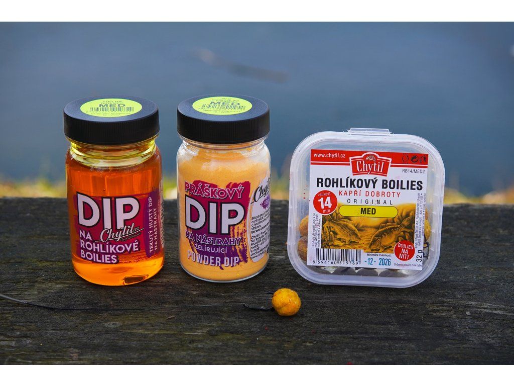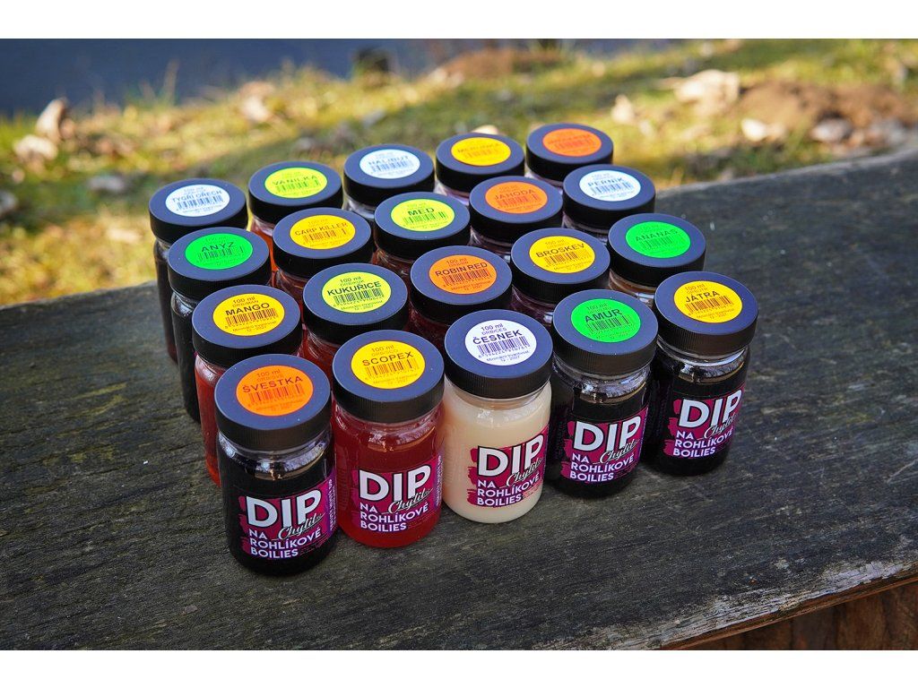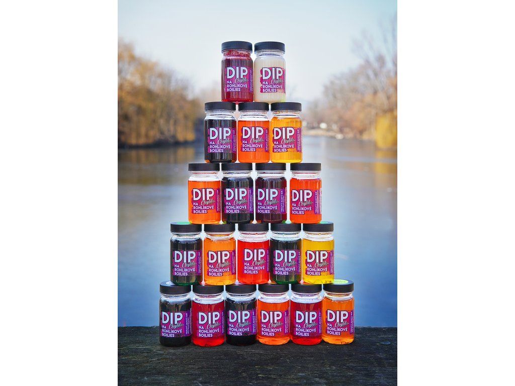 Náš TIP: Vezměte si tekutý dip, nástrahu a práškový dip. Nástrahu namočte do tekutého dipu, následně obalte práškovým, poté znovu do tekutého a znovu do práškového želé. Nechte pár vteřin oschnout a můžete nahazovat. Získáte tak velmi atraktivní, měkké barevné sousto, které ryby rozhodně nenechá v klidu! Postup vidíte ve fotogalerii.