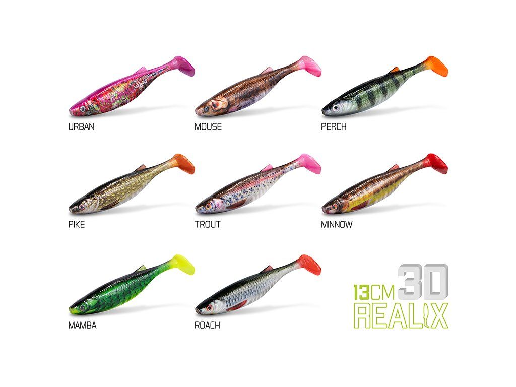 Delphin Realix 3D je měkká umělá nástraha typu paddle tail, která ve vodě dokonale imituje malou rybku. Její velikost je přizpůsobena lovu větších dravců, jako jsou štika, candát nebo sumec. Jak už název napovídá, jejím hlavním poznávacím znakem je realistický potisk, díky kterému jsou na jejím povrchu zobrazeny i ty nejmenší detaily. Realistický vzhled podtrhují výstupky a prohlubně napodobující žebra, žábrové oblouky či samotné ploutve. Aby byla nástraha ještě lákavější a viditelnější, její ocásek je zabarven UV aktivními barvami. Během vedení nástrahy ocásek výrazně kmitá ze strany na stranu, přičemž vytváří intenzivní vibrace dráždící smysly dravců. Nástraha skvěle pracuje i při pomalém vedení a při použití lehkých závaží. Barevná provedení nástrahy důvěrně imitují různé druhy ryb, jako je štika, pstruh nebo okoun. V nabídce však naleznete i netradiční barevné varianty napodobující myš, hada nebo růžovou kombinaci se vzorem grafity pod názvem Urban. Materiál se vyznačuje mimořádnou odolností a trvanlivostí, díky kterým nástraha vydrží opakované útoky predátorů. Dokonalé realistické zpracování a bezvadný pohyb nástrahy dokáží oklamat i ty nejopatrnější predátory a vám zaručí časté záběry při vašich toulkách za dravci. Technické parametry: Hmotnost nástrahy: 16gDoplňkové parametry