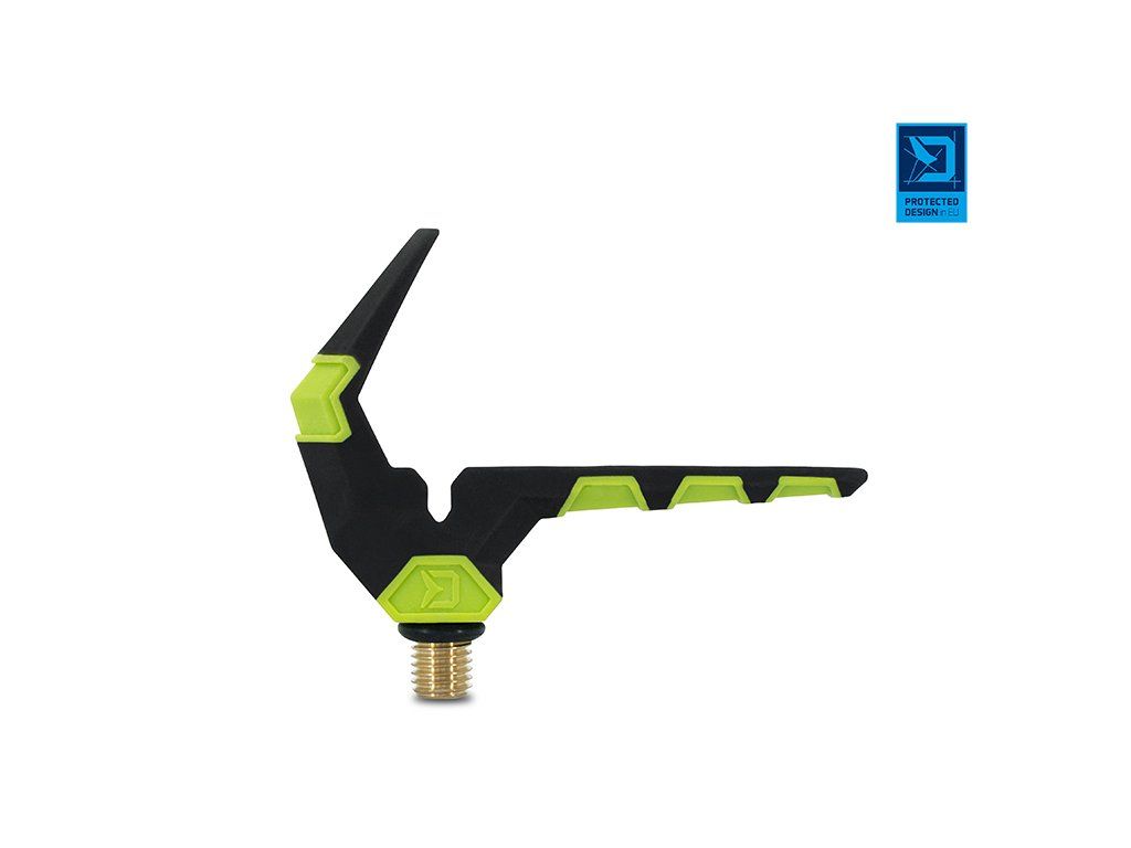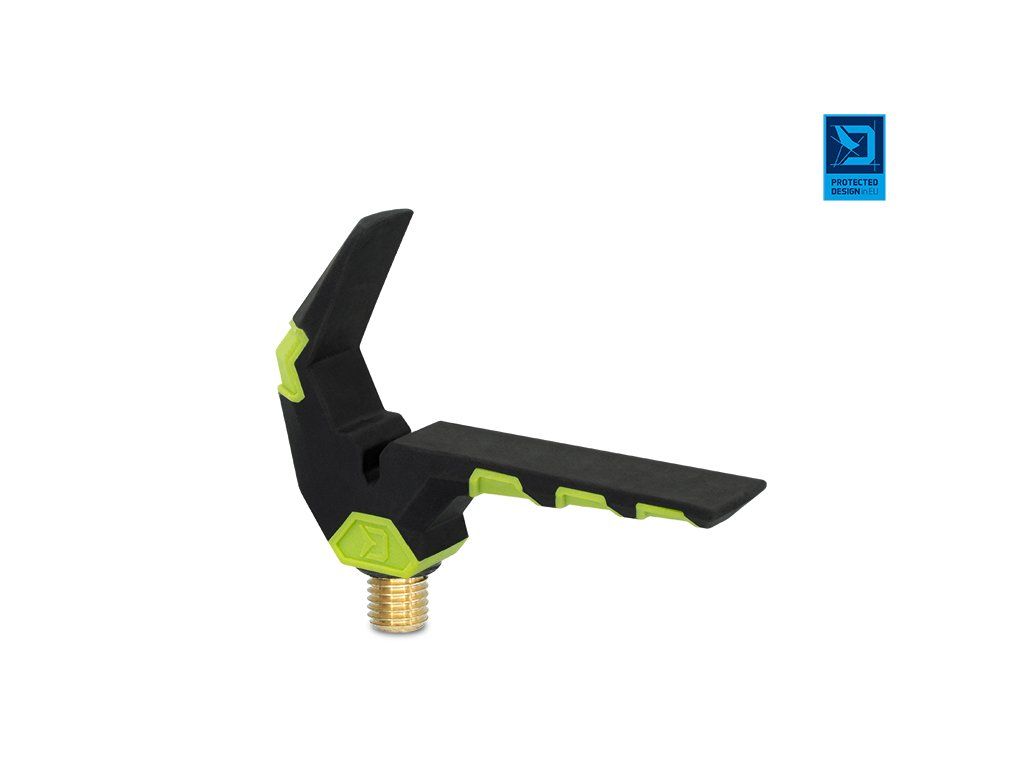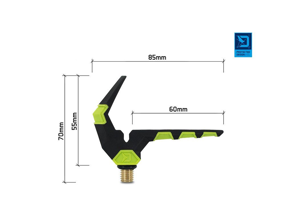 Přední feederový držák vysoké kvality v barvách inovativní feederové série Delphin Reaxe. Jeho speciálně navržený tvar s extra dlouhým ramenem zajišťuje dokonalé uložení prutu a zabraňuje jeho vytržení i při nejrazantnějších záběrech. Držák je opatřen drážkou pro volný přechod vlasce, pro maximální eliminaci tření. Povrch je potažen pogumovaným materiálem, který je extra šetrný k povrchu prutu a tím předchází jeho poškození. Držák je vyroben z odolných materiálů, takže se snadno nepoškodí a nepoškrábe. Univerzální závit umožňuje uchycení na všechna standardní ramena, stojany a vidličky. Na závitové části se nachází gumová podložka, která zamezuje otáčení držáku. Technické parametry: Celková výška: 55mm Celková šířka: 85mmDoplňkové parametry
