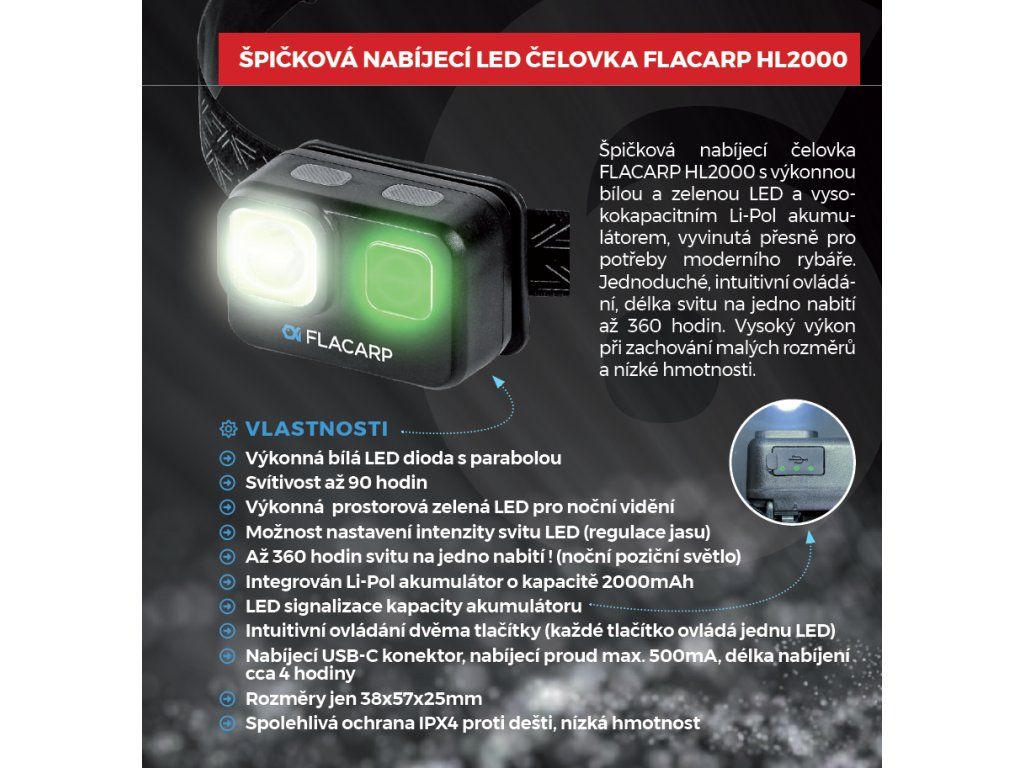 Výkonná čelovka HL2000 se zeleným světlem a režimem dlouhé doby svitu. Na základě přání vás rybářů jsme vyvinuli moderní čelovku FLACARP HL2000. Lehkou, výkonnou, snadno ovladatelnou se silným bílým a nočním zeleným LED světlem. Výkonný akumulátor 2000mAh se postará o extrémní výdrž (běžné světlo: až 90 hodin, noční poziční světlo: až 360 hodin na jedno nabití).Čelovka se snadno ovládá dvěma tlačítky: prvním bílou LED, druhým zelenou LED.