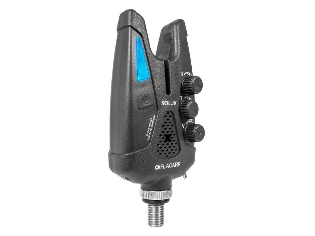 Signalizátor záběru FLACARP SOLUX se solárním nabíjením. Osvědčený design a funkce výkonného hlásiče se vším, co rybář potřebuje, navíc s integrovaným solárním panelem na zadní straně.