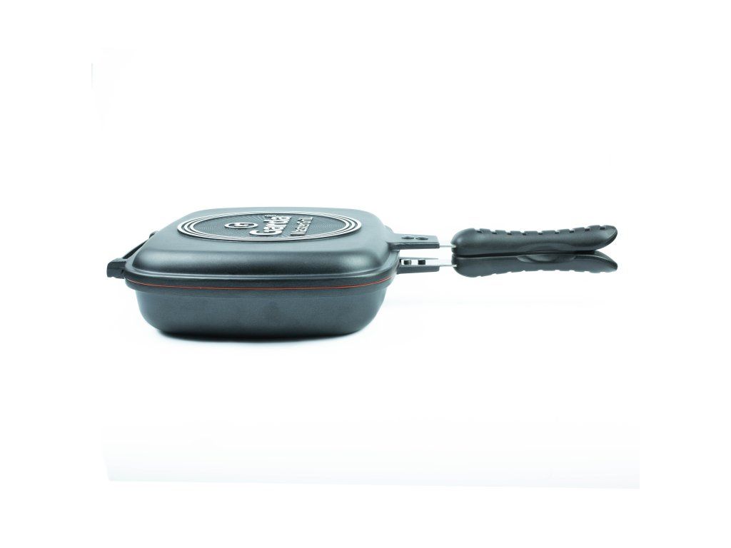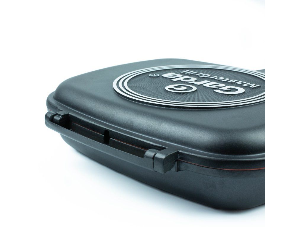 Pánvička Garda Grill Master je ideální pomocník pro přípravu jídla u vody. Skládá se ze dvou pánví o rozměru 27 x 24 cm, z nichž jedna je hlubší a jedna mělčí. Má oboustranný nepřilnavý povrch, krásný design, dva různé povrchy dna, speciální těsnění mezi oběma pánvemi a pohodlnou rukojeť s magnetickým klipem. Je z vysoce kvalitní litiny, která zaručuje životnost po mnoho let. Jídlo se na ní nepřichytává, proto se velmi snadno čistí. Je skvělá pro grilování, opékání, pečení, smažení, přípravu toastů a další úpravu jídel, dokonce v uzavřeném stavu funguje podobně jako „papiňák“. Její vyšší hmotnost je jednak známkou kvality materiálu, navíc zajišťuje stabilitu na vařiči. A v neposlední řadě vám do ruky dává pádnou zbraň při ochraně před sousedními rybáři, divokými prasaty či neohlášenými porybnými.Rozměry: 24x27x7cm + 18cm rukojeť