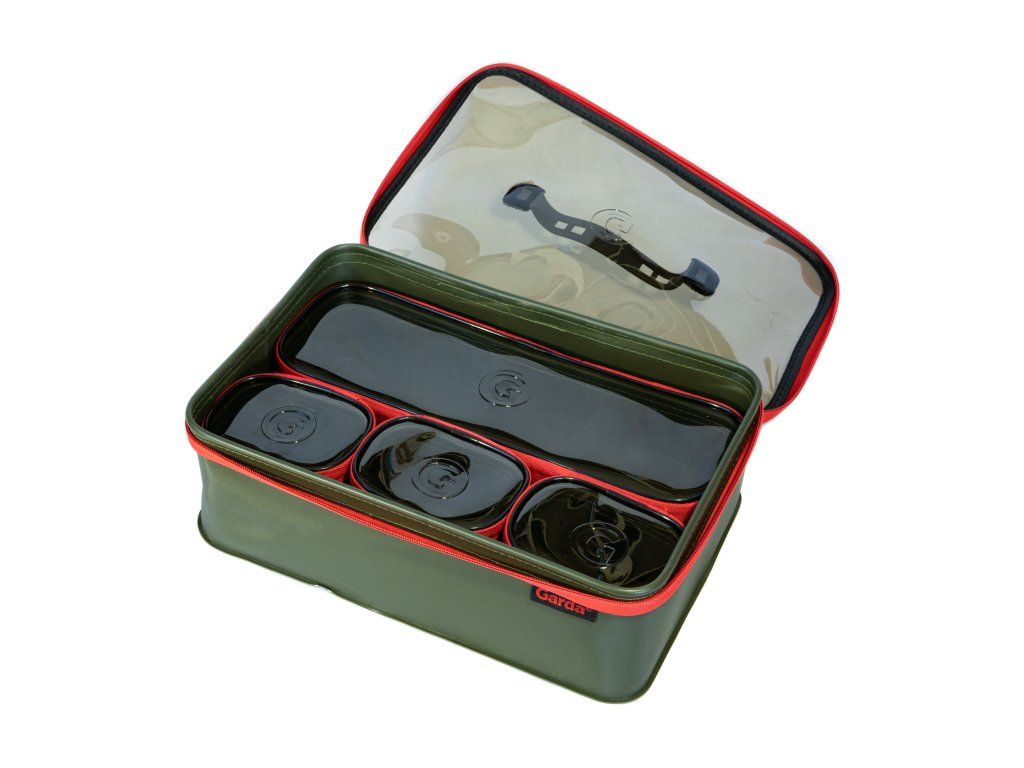 Garda EVA Master Case Set 4+1 o celkovém rozměru 37 x 25 x 12 cm je velmi praktické pouzdro a organizér, do kterého lze umístit veškeré rybářské pomůcky. Kromě hlavního pouzdra obsahuje i jedno dlouhé a tři menší vnitřní. Lze si tak dobře rozložit a oddělit různé typy pomůcek. Tyto menší pouzdra se prodávají i samostatně, a tak, pokud budete chtít, můžete si svůj set přetvořit podle vašich požadavků. Velkou výhodou je, že EVA materiál je velmi odolný, omyvatelný a voděodolný. Průsvitná vrchní část vám umožní poznat, co se v pouzdru nachází. Vrchní madlo usnadňuje přenášení.Doplňkové parametry