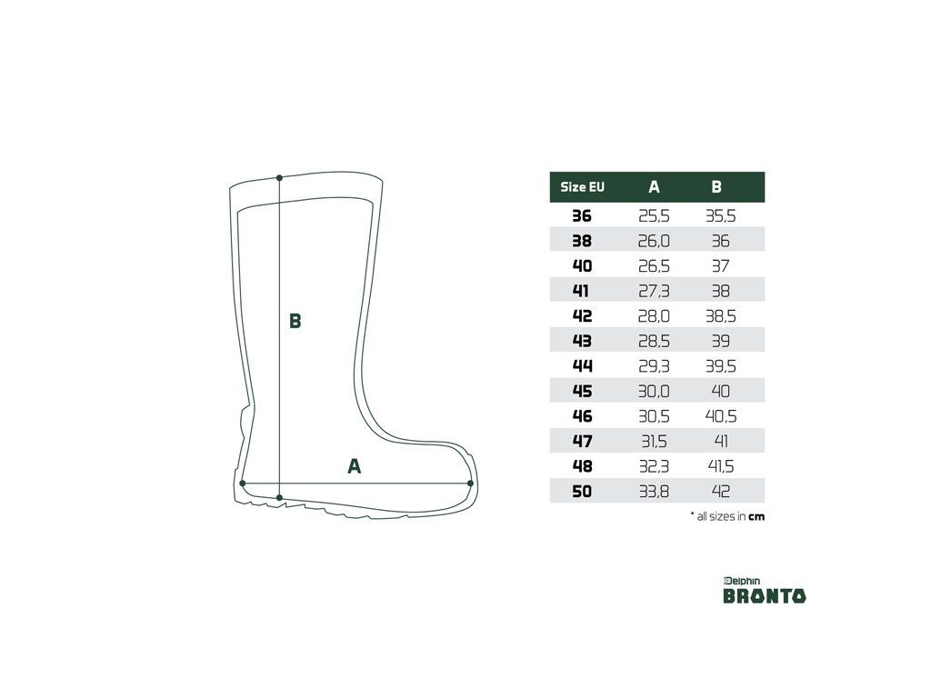 V momentě, kdy začaly vznikat první skici modelu BRONTO jsme si byli jisti 3 základními principy, na kterých jsme chtěli tyto holínky postavit. Prvním byla maximální funkčnost. Druhým netradiční design přihlížející na všechny uživatelské potřeby a třetím vysoká míra uživatelského komfortu. Hranice mezi těmito třemi principy jsou někdy opravdu minimální a ve většině případů mají dokonce tyto principy vzájemné přesahy. Jisté je jen jedno. Přestože trh je plný různých modelů EVA holínek, na základě našich dlouholetých zkušeností jsme vyvinuli model, který má sice stejný základní materiál, ale už po prvním použití ho budete vnímat jako něco diametrálně odlišného od ostatních běžně dostupných holínek. Většina modelů používá konvenční materiál, včetně tloušťky jeho stěny. My jsme nešli cestou minimalizace nákladů a oproti zažitým trendům poskytujeme až cca o 10% silnější stěny v námi vybraných oblastech. Důvodů je hned několik. Naše boty mají vyšší tuhost podešve, a tak nepřenášejí na vaše chodidlo nerovnosti terénu v obvyklé míře. Silnější znamená lepší i co do izolačních vlastností boty. To oceníte zejména v zimě. Vyztužili jsme také oblast chránící holenní kosti a špičku boty, což způsobí, že prodírání terénem, kde se nachází množství větví nebude plné bolestivých zakopnutí. Samotná bota má mírně užší tvarování, což způsobí nižší tepelné úniky během zimy, ale i příjemnější chůzi, kdy noha v botě zbytečně "neutíká". Netřeba se však bát zhoršeného vyzouvání či obouvání. Mysleli jsme i na lidi, kterým se do holínek hůře ohýbá. Nad patou se nachází výstupek, tzv. ''ostruha'', kde je možné jednoduché zapření a následné lehké vyzutí holínky. Vnitřní filcová vložka dokonale sedne dovnitř a zvyšuje jak tepelný, tak uživatelský komfort. Samotný reliéf podešve je velmi členitý s výraznými výstupky, které zaručí perfektní přilnavost za jakýchkoliv podmínek. Navíc mají jednotlivé výstupky velmi hustou strukturu, což přispívá ke stabilitě i na zledovatělých plochách. Vnímavému oku neunikne, že samotná podešev je vyskládaná z prvků našeho loga :) A proč vlastně BRONTO? Inspirací nám byla prehistorická zvířata vyznačující se svojí životností, odolností a výbornými schopnostmi přizpůsobit se. Právě proto jsme model holínek nazvali BRONTO, protože nezáleží na tom, zda je venku -40 ° C, zda jdete do lesa, nebo rybařit. Delphin BRONTO je zde pro to, aby 100% ochránil komfort vašich nohou!Doplňkové parametry