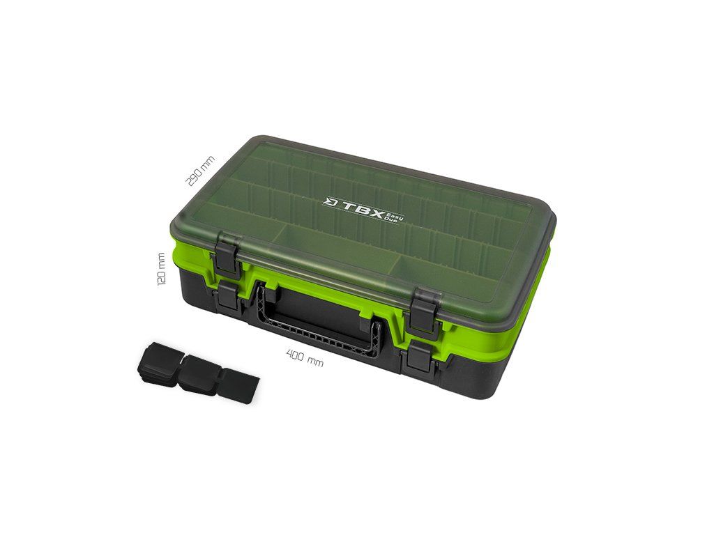 Delphin TBX EasyDuo je prakticky řešená krabice s úchopem na způsob kufříku se dvěma oddělenými prostory na odkládání. Dokonce ji můžete nosit jako kufřík. Velmi dobře poslouží k uložení nástrah nebo ostatního rybářského příslušenství. Klipy, kterými otevíráte jednotlivé sekce, jsou důmyslně a prakticky navrženy. Pevně drží spoje a nemusíte mít starost, že by se jedna ze sekcí při přepravě otevřela. Je dodávána ve vkusné kombinaci barev černá, světlezelená s šedým transparentním poklopem na vrchní části. Parametri tehnici: Dimensiuni: 400x290x120mm Numărul compartimentelor fixe: 10 Dimensiunile compartimentului: 1x(36x19x6,5cm), 3x(36,5x6x5cm), 3x(12x6x5cm), 3x(12x6x6,5cm) Numărul compartimentelor introductibile: 17Doplňkové parametry