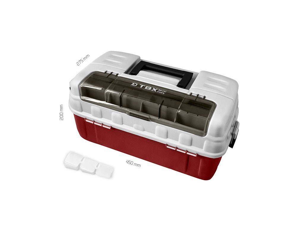 Delphin TBX MultiCase je multifunkční kufřík vyrobený z plastu, který nabízí množství prostoru pro odkládání všeho, co rybář potřebuje. Skládá se ze tří poliček, spodního odkládacího prostoru určeného pro větší předměty a vnějšího úložného prostoru s krytkou vyrobené z průhledného plastu. Balení obsahuje také plastové příčky, aby si každý rybář mohl tyto přihrádky přizpůsobit podle vlastních představ. Uzavírá se dvěma plastovými klipy s kovovými sponami, které pevně drží dva vrchní výklopné díly. Je dodáván v kombinaci barev stříbrná a bordó. Technické parametre: Rozmer: 450x275x200mm Počet pevných priehradiek: 34 Rozmer priehradky: 1x(41x23x7,5cm), 13x(13,5x4,3x3cm),4x(4,5x4,5x3cm),6xx(9x4,5x3), 1x(13x9x3cm),1x(35,5x4,3x3), 12x priehradka rôznej veľkosti a hĺbky na odkladanie rybárskeho príslušnstva z vonkajšej strany Počet vkladateľných priečinkov: 10 Műszaki paraméterek:Doplňkové parametry