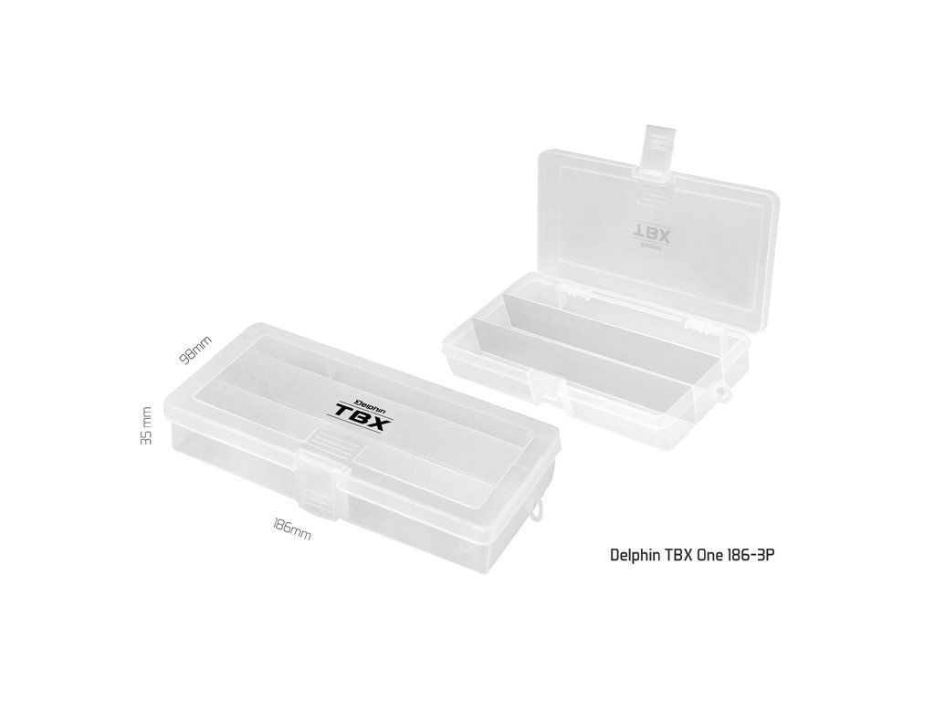 TBX ONE je řada multifunkčních krabiček určených pro uložení rybářského příslušenství. Vyrobené jsou z transparentního plastu, takže máte vždy dokonalý přehled o uložených věcech uvnitř krabičky. Řada TXB ONE je vybavena praktickými klipy z transparentního plastu. Technické parametre: Model: Delphin TBX One 162-3P Rozměr: 162x86x35mm Počet pevných přihrádek: 3 Rozměr přihrádky: 15,7x2,6x2,9cm Počet vkladatelných příčníků: 0 Model: Delphin TBX One 186-3P Rozměr: 186x98x35mm Počet pevných přihrádek: 3 Rozměr přihrádky: 18,1x3,1x3,0cm Počet vkladatelných příčníků: 0 Model: Delphin TBX One 214-3P Rozměr: 214x113x41mm Počet pevných přihrádek: 3 Rozměr přihrádky: 20,9x3,6x3,5cm Počet vkladatelných příčníků: 0Doplňkové parametry