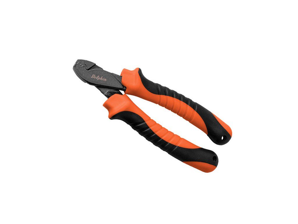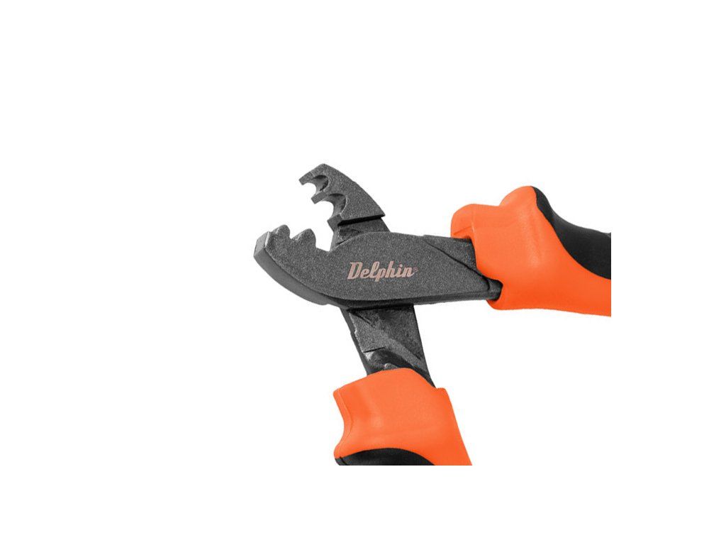 Praktická pomůcka pro všechny, kteří si potrpí na vlastnoručně udělané montáže. CRIMPER vám pomůže při výrobě všech koncových montáží, při kterých je třeba použít fluorokarbon či lanko a vyhotovit pevné smyčky. Čelisti kleští mají širší a hlubší otvor a jeden užší a mělčí. Krimpovací spojka je tlakem přitlačována až v 6 bodech, protože jedna strana čelistí má zoubkování. Proto se nemusíte obávat o pevnost spojení a užívat si lov kaprů nebo dravců. Hloubka krimpovacích čelistí je 9mm. S celkovou délkou 16cm mají ramena téměř 13cm, díky čemuž je vytvořena opravdu silná páka. Rukojeť je pro dobrý úchop pogumovaná. Na obou ramenech rukojeti se nacházejí otvory na provlečení šňůrky. Ramena jsou v černo-oranžové barvě kvůli lepší viditelnosti v šeru, nebo v situacích, kdy je rychle potřebujete najít. Technické parametry: Délka: 16cm Šířka: 5,5cm Hloubka čelistí: 9mm Hmotnost: 200gDoplňkové parametry