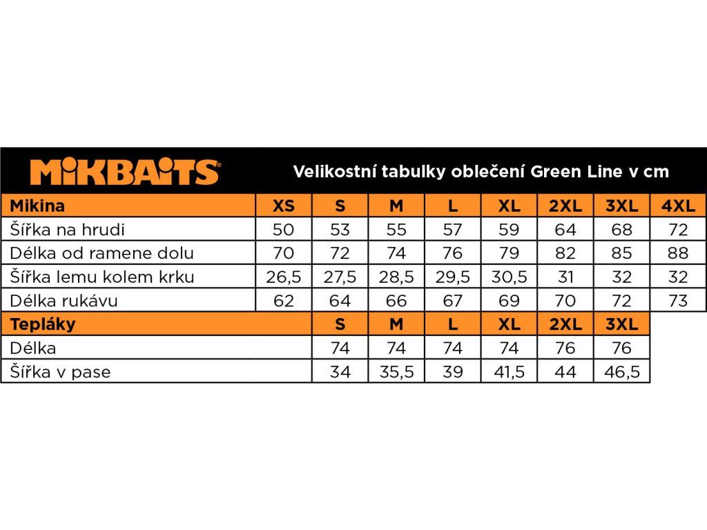 Kolekce oblečení Mikbaits Green line zahrnuje vedle mikin i kraťasy a tepláky. Jsou z velmi příjemného pohodlného materiálu, mají elastické zakončení pasu i nohavic, dvě kapsy na zip po stranách a vzadu menší kapsu s logem. Podobně jsou řešeny i kraťasy. Vše ve velikosti M až 4XL.