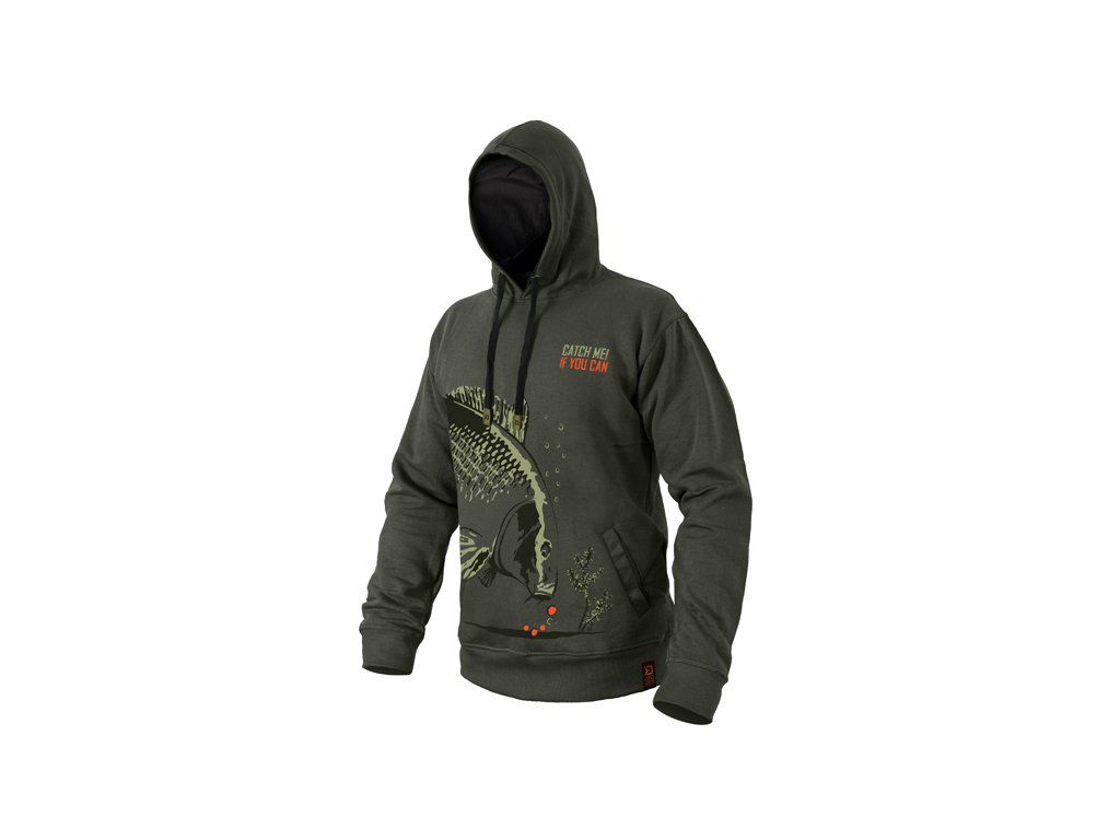 Druhá generace kaprařských mikin Catch me s naším vlastním a kompletně obnoveným barevným designem. Série CATCH ME IF YOU CAN (chyť mě pokud to dokážeš) s vyobrazením kapra je nevšední kousek do vašeho, nejen kaprařského šatníku. Malba kapra prochází kolem dokola celého trupu v jeho spodní části. Kapr je zobrazen jako skica či malba při zachování všech důležitých detailů. Ryba je zachycena v situaci, kdy se blíží k hrsti boilies, což je právě ten moment, na který všichni na břehu čekáme. Mikina je designována do tmavě zelené barvy s efektní oranžovou a světle zelenou grafikou. Vybraná tkanina je vysoké kvality, stejně jako použitý barevný tisk. S oblečením CATCH ME IF YOU CAN budou všichni vědět s kým mají co dělat! Nabízíme je v široké škále velikostí, ze kterých si určitě vyberete. Technické parametry: Materiálové složení: 60% Polyester, 40% BavlnaDoplňkové parametry