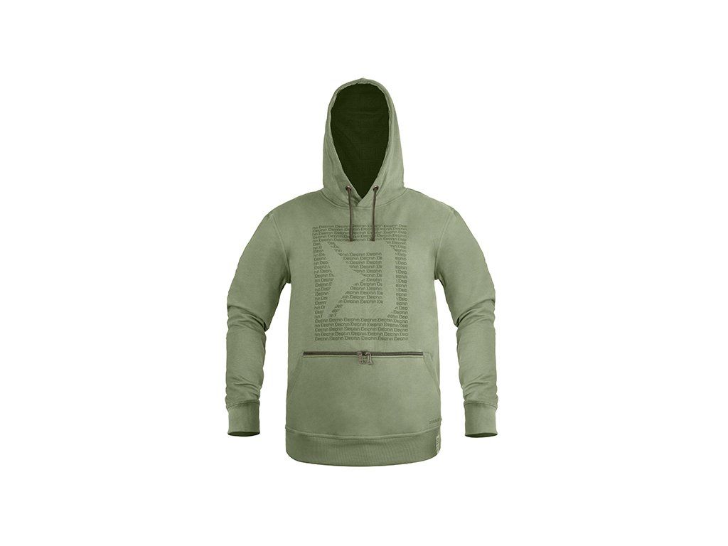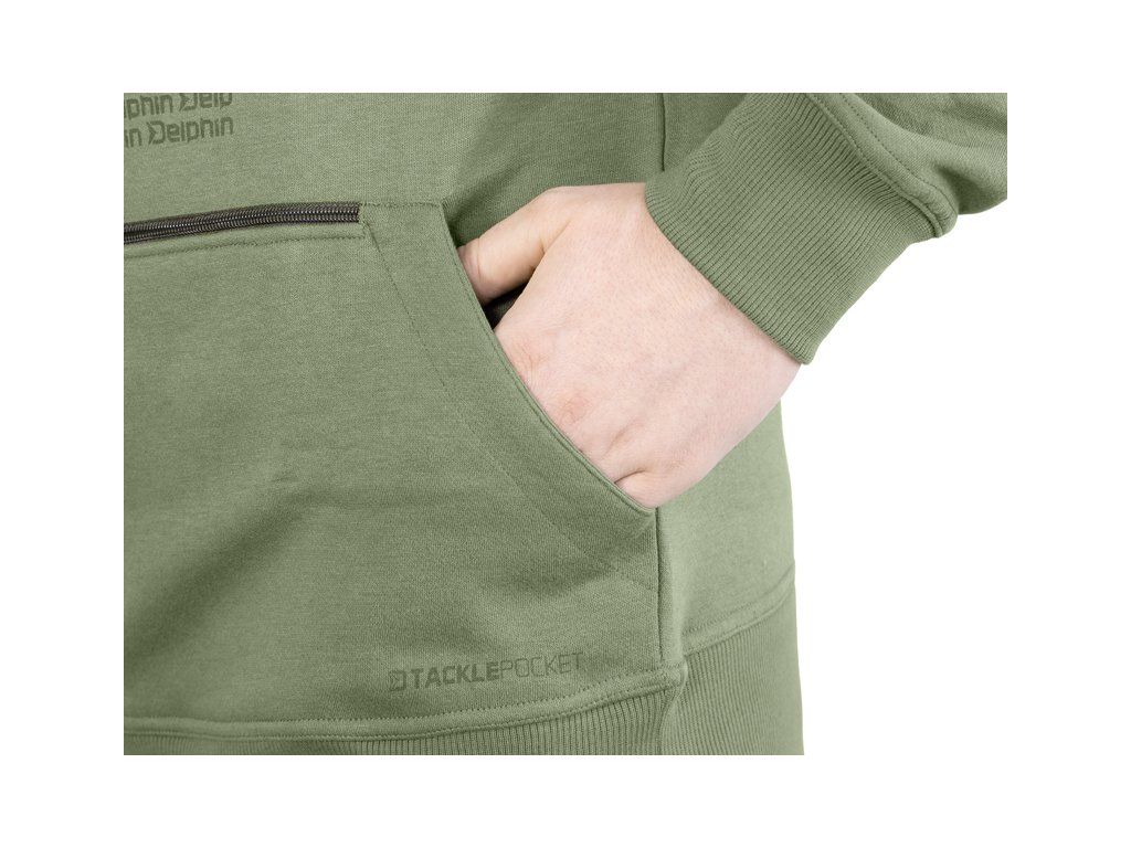 Mikina přinášející maximální komfort a zároveň styl během rybářských výprav, procházek přírodou či městem. Je vyrobena z tkaniny zelené barvy, která je pružná a příjemná na dotek, díky čemuž se velmi dobře nosí. Mikina je opatřena dostatečně velkou kapucí, která je navíc doplněna širokou šňůrkou pro zatažení v případě potřeby. Rukávy jsou na koncích zúžené a vybaveny gumičkou pro lepší obepnutí zápěstí. Mikina disponuje také rozměrnou kapsou TACKLE POCKET, na oboustranný zip, která je určena na jakékoli rybářské příslušenství, či jiné potřebné věci jako mobil nebo peněženka. V další vrstvě se nachází velká tunelová kapsa vhodná pro zahřátí rukou v nepříznivém počasí. Spodní část disponuje také elastickou gumičkou určenou pro zlepšení přilnavosti na tělo. Důkladně promyšlený design LOGOS se skládá z menších nápisů Delphin vytvářejících zajímavou mozaiku ve tvar našeho loga. Je doplněn také decentními logy SGN a TACKLE POCKET. Technické parametry: Materiálové složení: 60% Polyester, 40% BavlnaDoplňkové parametry