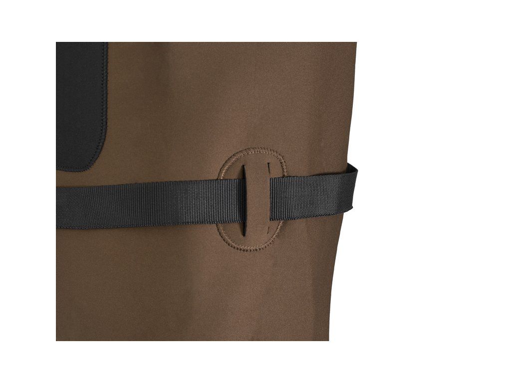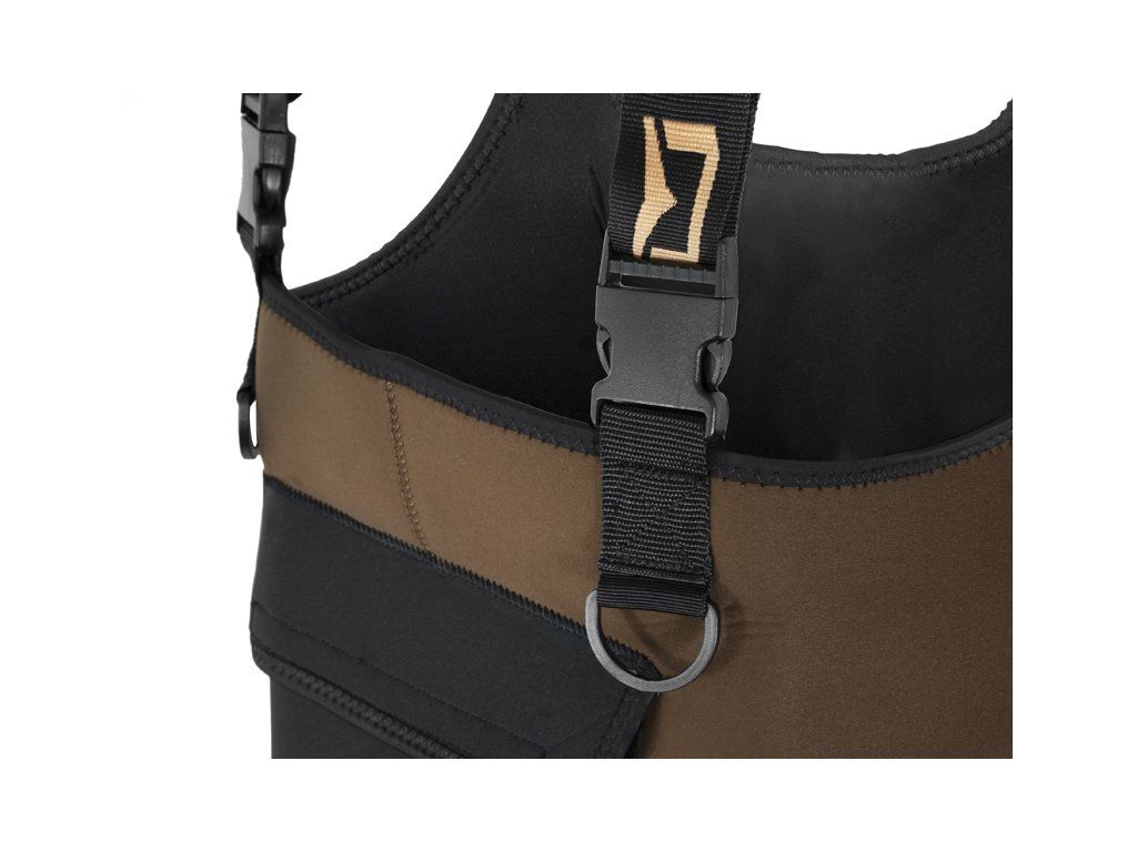 Při zimním rybaření je třeba myslet hlavně na tepelný komfort. Ten dokážou ideálním způsobem zajistit neoprenové prsačky Delphin ORAVA. Vyznačují se kvalitním provedením a elegantním designem. Každé prošití a namáhané spoje jsou precizně ošetřeny, aby zabránily nechtěnému prosakování. Hnědá barva neoprenu zamezí vzniku velkého množství viditelných skvrn ze slizu a dalších různých nečistot. Neodmyslitelným pomocníkem je neoprenová kapsa na přední straně prsaček, kde si můžete odložit například povolení k rybolovu. Nemusíte se bát ani kleknutí na zem, protože v kolenní části jsou prsačky zpevněny dvojitou vrstvou neoprenu. Nastavitelné popruhy na ramena jsou také vybaveny neoprenovou výstelkou, aby bylo nošení prsaček během celodenních vycházek pohodlné a ramena méně namáhána. Pod šlemi se také nacházejí dva plastové kroužky, na které lze pomocí joja, nebo karabiny uchytit různé pomůcky, jako například pean nebo metr. Součástí balení je i brodící pásek, který zamezí natečení vody do prsaček při nechtěném uklouznutí nebo pádu. Pryžové kozačky s odolnou a stabilní podrážkou vás podrží i v náročnějších podmínkách. Jejich vnitřek je vystlán neoprenovou vložkou, která chrání nohy před chladem. Složení: Neopren/PVC Tloušťka neoprenu: 4 mmDoplňkové parametry