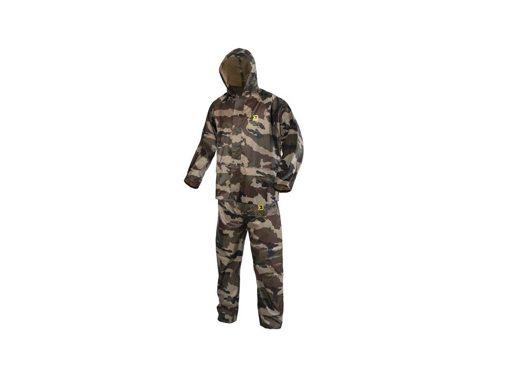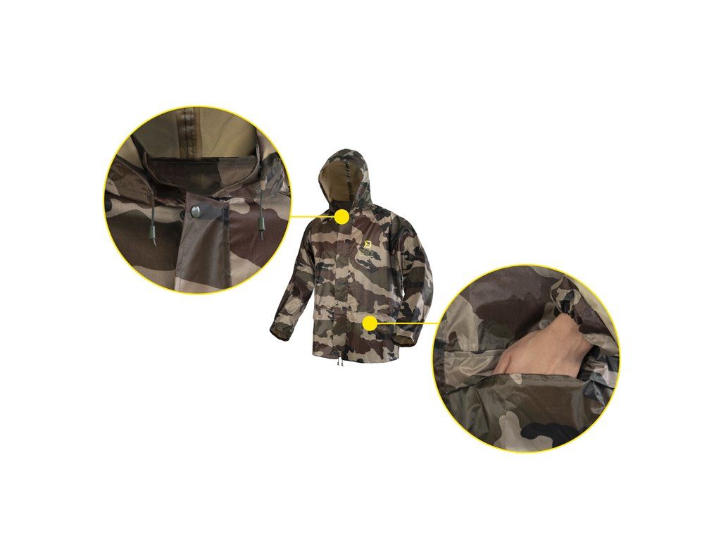 Do deštivých dnů je zde nepromokavý komplet Delphin PROOF, který vás dokonale ochrání před nepřízní počasí a překvapí svými kompaktními transportními rozměry. Je vyroben z voděodolné pogumované tkaniny s podlepenými švy a maskáčovým vzorem. Bunda Zapínání bundy je zajištěno pomocí odolného zeleného zipu překrytého lemem tkaniny se zapínáním na 4 plastové cvoky, což zvyšuje ochranu před deštěm. Kapuce je vybavena zatahováním na šňůrku, takže je možné přizpůsobit si ji podle svých potřeb a navíc si ji můžete srolovat a zazipovat do límcového prostoru. Límec je vyvýšen pro lepší překrytí krku a šíje a opatřený dalšími dvěma cvoky na připnutí kapuce. Konce rukávů mají přidané gumičky zabudované do jejich vnitřku, pro lepší utěsnění před vodou. V oblasti mezi lopatkami se z vnitřní strany nachází také síťka určená pro lepší odvětrávání. Spodní část bundy PROOF je opatřena šňůrkou s plastovými koncovkami pro zatažení pod úrovní pasu. Na obou stranách se nacházejí rozměrné kapsy s efektivním překrytím. Kalhoty Disponují pružnou gumičkou v oblasti pasu díky čemuž se snadno a rychle v případě potřeby oblékají. Celkový střih kalhot je volný a tudíž si je můžete natáhnout i na zimní oblečení. Spodní část je opatřena cvoky, pomocí kterých je lze zúžit. Oblek je balen v praktickém pouzdru se zipem vhodným pro transport v suchém či mokrém stavu, čímž ochrání ostatní věci před nechtěným namočením. Technické parametry: Materiálové složení: 100% Polyester s PVC povrchem Transportní rozměry: 32x27x5cmDoplňkové parametry