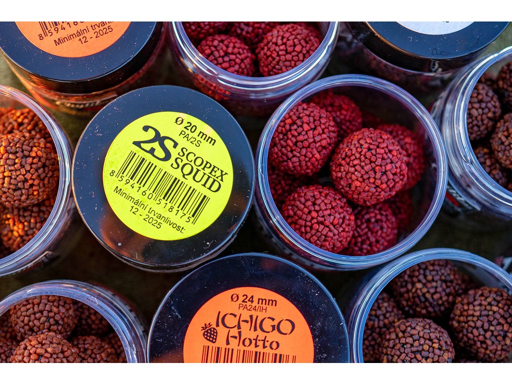 - Ichigo Hotto = Jahoda/Chilli toto boilies neobsahuje ani gram rybích a masových mouček, je dobře stavitelný, pozvolna se uvolňuje, je vhodný na pravidelné krmení. Šmrnc mu dává exkluzivní japonská jahodová esence, která nejen že voní po jahodách, ale je zároveň v chuti ostrá jako meč japonského samuraje. Roční období: J, L, P, Z, Typ vody: Ř, Š