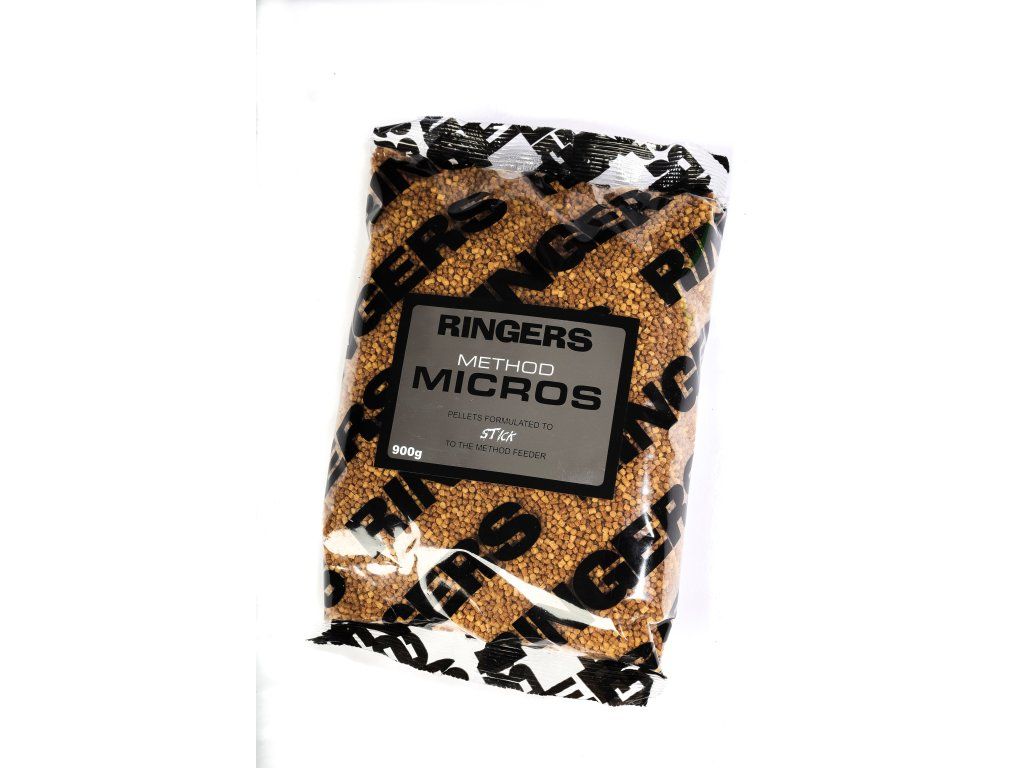 Ringers Method micro jsou 2 mm peletky, které jsou perfektní pro method feeder, ale můžou být použity i do klasického feeder košíku. Mají vysoce atraktivní složení přizpůsobené pro chytání kaprů a kaprovitých ryb. Protože neuvolňují tak malé drobky jako mixy, jsou peletky ještě účinnější na velké exempláře ryb. Před použitím je změkčete. Například tak, že je zhruba na jednu minutu zalijte vodou, poté vodu slijte a nechejte 5 až 6 minut měknout. Pak už je možné je vmačkávat do krmítka. Zde vytvoří nadýchaný „kopeček“ návnady, která je neodolatelná.