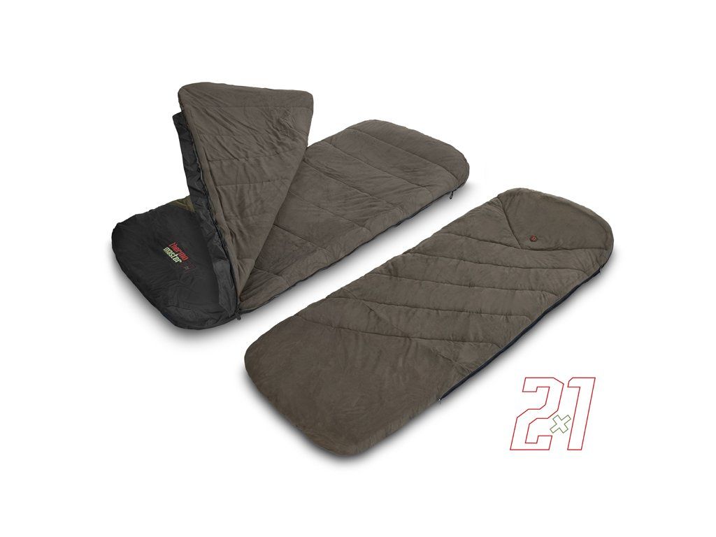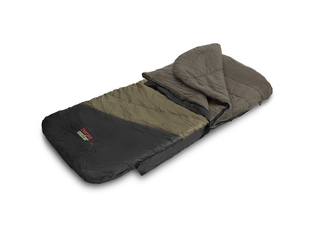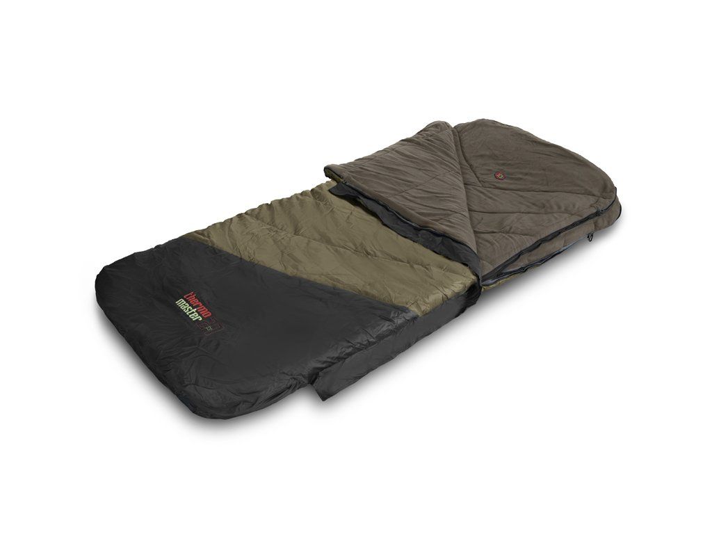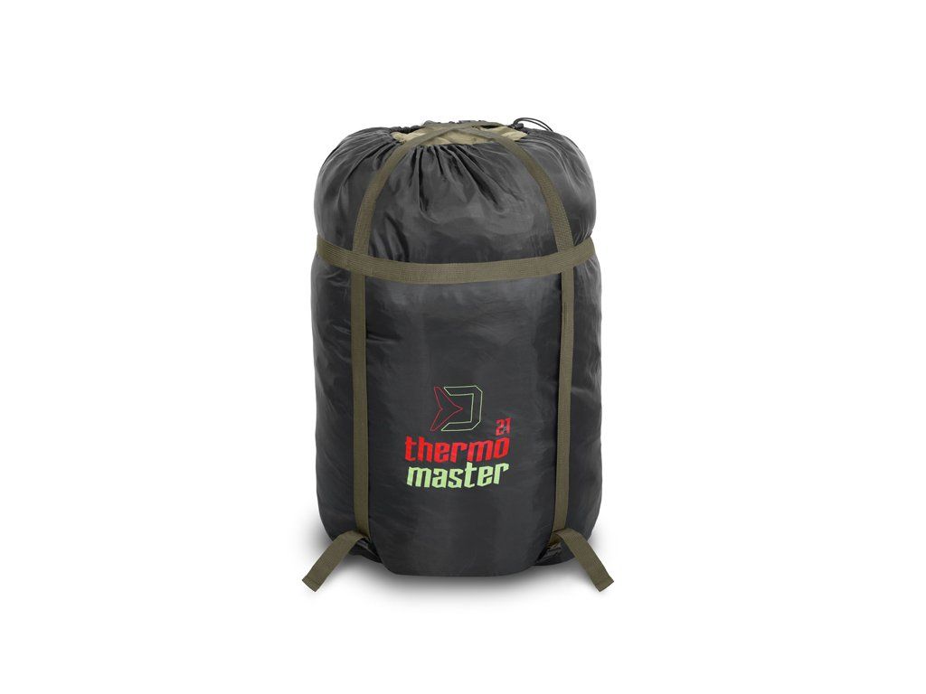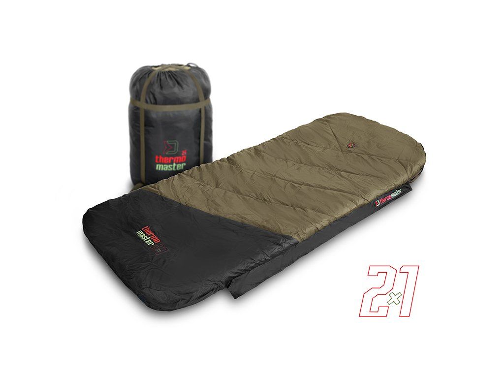 2 samostatné spacáky v jednom! ThermoMASTER je revoluční produkt s vlastnostmi, jaké se nevidí často. Je totiž tvořen až čtyřmi samostatnými vrstvami umožňujícími jeho použití jako extra hrubý a teplý zimní spací pytel, vhodný do teplot pod bodem mrazu. Avšak vnitřní dvě vrstvy lze kompletně odzipovat, vyjmout a použít je jako tenčí letní spací pytel pro Vaši polovičku nebo parťáka. Použili jsme při jeho výrobě odolnou a nepromokavou vnější tkaninu, díky které lze přespávat pod otevřenou oblohou i za deště a vlhkých chladných nocí. Navíc je snadno udržovatelná, takže ji lze snadno otřít a osušit. Přichycení spacáku na postel je zajištěno pomocí návleků na obou koncích a fixačního popruhu s pevným a mohutným klipem, díky kterým zůstane ThermoMASTER jako přikovaný ke lehátku za každých okolností. Všechny vnitřní vrstvy jsou tvořeny měkkým fleecem hnědé barvy, který je příjemný na dotek a také výjimečně hřejivý, takže se budete cítit komfortně i v extrémní zimě. Hlavní zip po obou stranách je mohutný, pevný a nezasekává se, čili pokud budete mít záběr, stačí potáhnout vrchní vrstvu a můžete utíkat za rybou. Zip na druhé straně si můžete zafixovat pomocí plastové pojistky ve tvaru spony. Mezi každou vrstvou se nacházejí další jemnější zipy umožňující využití kterékoli z vrstev dle vnějších podmínek a Vaší osobní preference. Všechny zipy jsou překryty lemem nepromokavé látky, a tím pádem chráněny před deštěm. V hlavové části se nachází kapsa vhodná pro umístění a uzavření jakéhokoli menšího polštáře. ThermoMASTER má zajímavý design v khaki a černé barvě s výraznou červeno-zelenou grafikou. Balen je v rozměrném černém vaku s popruhy a zatahováním na šňůrku. Technické parametry: Rozměry: 220x90cm Přepravní rozměry: 62x40x40cm Hmotnost: 6,8kgDoplňkové parametry