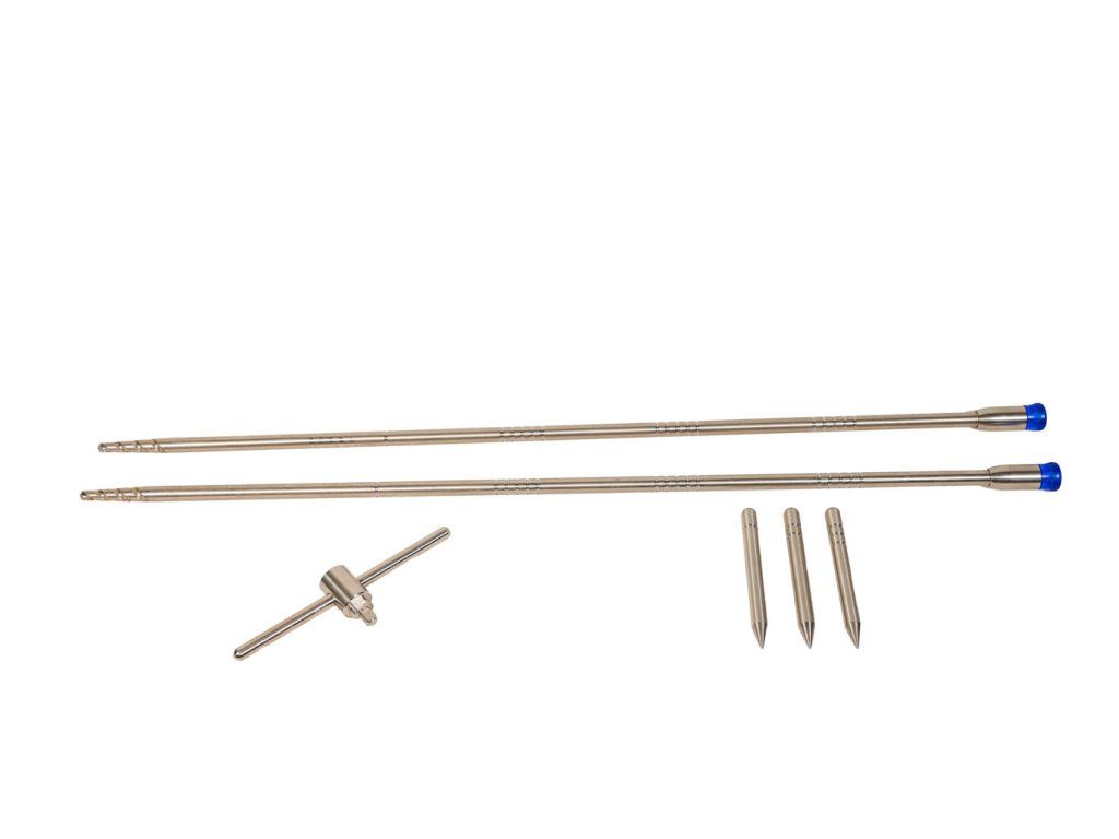 Nerezové měřící tyčky o délce 60 cm byly navrženy pro rybáře, kteří mají rádi stylové UK produkty. Jsou precizně zpracované z nerezové oceli, mají zavrtávací hroty, na vršku speciální koncovku pro vložení isotopu, 3 kolíky pro jednotlivé pruty a kvalitní pouzdro.