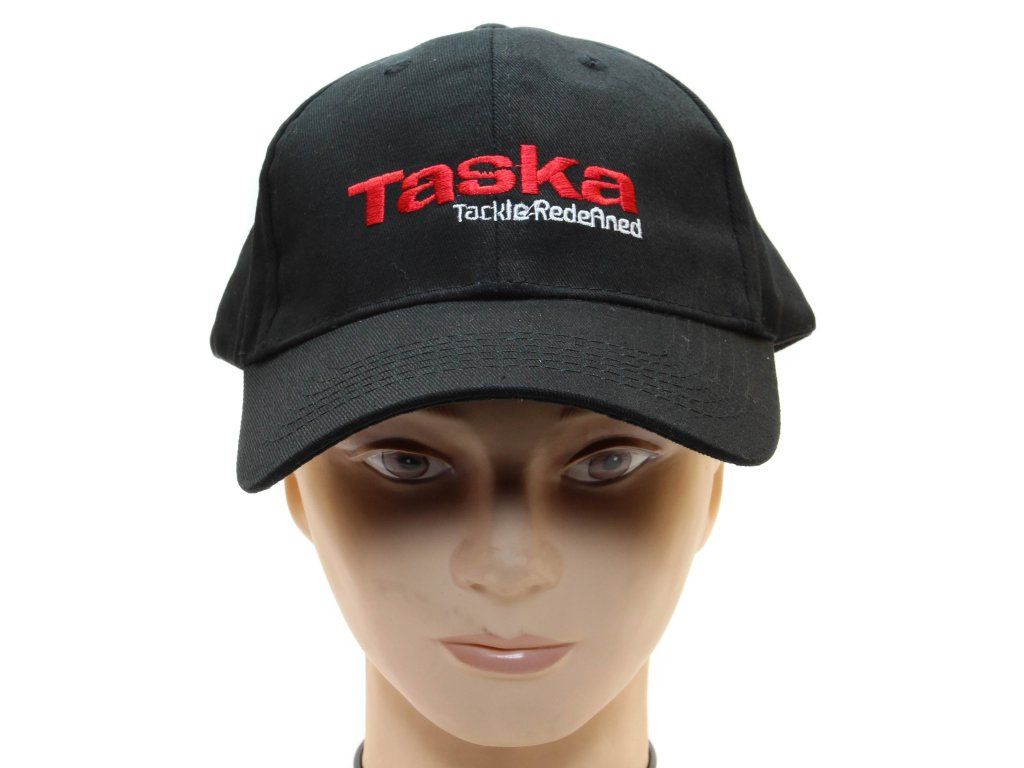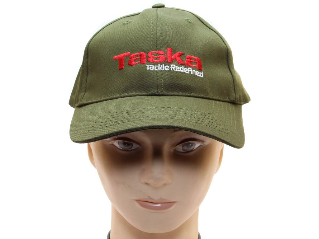Zelená čepice s kšiltem a červeným logem Taska s možností upravit si velikost.