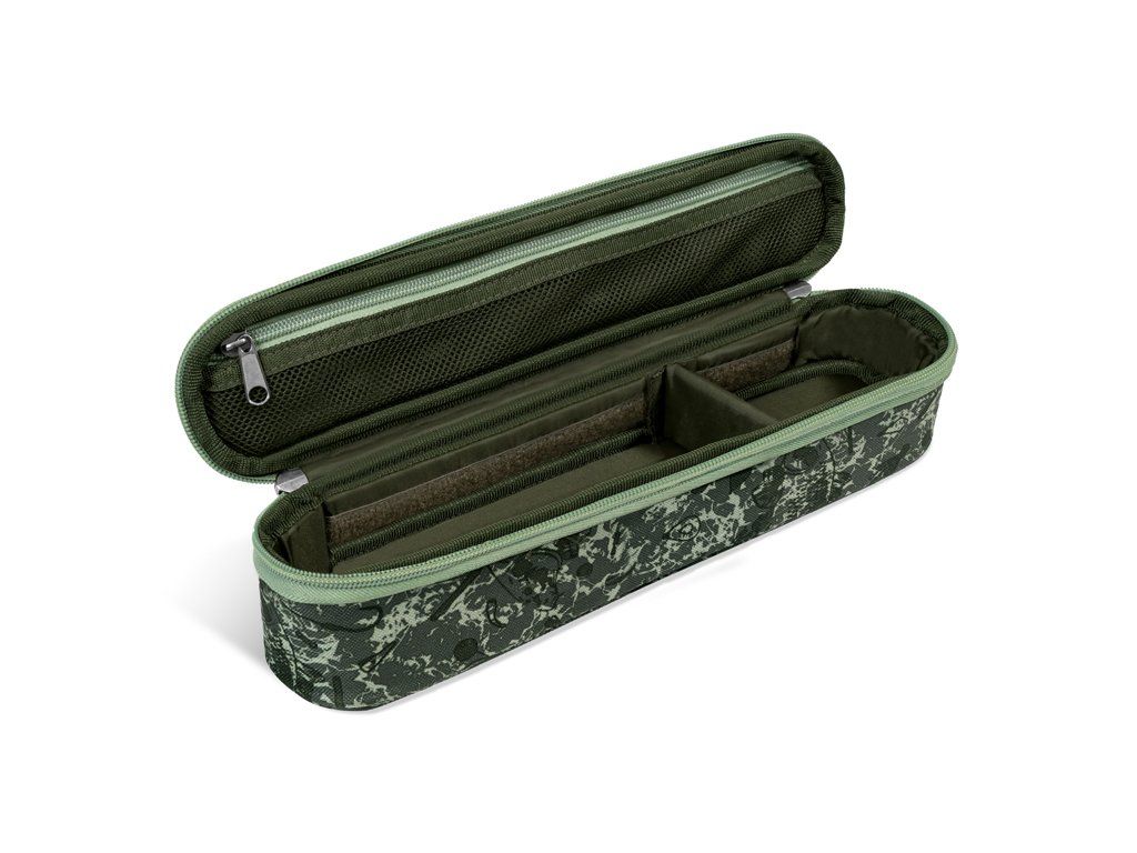 Delphin SPACE je označení pro exkluzivní sérii tašek z dílny značky Delphin. Vyznačuje se špičkovým zpracováním, kvalitními zipy, ale zejména výjimečným designem s použitím C2G kamufláže. Pokud často neumíte najít ve vaší výbavě to správné místo na svítidla jako čelovky, či trubicové bivakové světlo a obvykle je jen tak hodíte mezi ostatní věci, tak jistě oceníte Delphin Light SPACE C2G. Jedná se o důmyslně navrženou tašku, jejíž boční a spodní stěny jsou tvrzené, čímž budou vaše svítidla vždy důkladně chráněna před znehodnocením či nechtěným zapnutím. Vnitřní prostor lze přizpůsobit pomocí odnímatelné přepážky na suchý zip a je tedy jen na vás jak si jej upravíte na základě toho, co uvnitř chcete přenášet. Polstrované víko je zevnitř opatřeno praktickou síťovou kapsou na zip, do které můžete uložit další drobné příslušenství ke svítidlům jako baterky, konektory či nabíjecí kabely. Technické parametry: Vnější rozměry: 35x8x7cm Rozměr vnitřní kapsy: 32x6 cm Stylová patentovaná kamufláž z dílny značky Delphin pod označením C2G má mnoho podob a úhlů pohledu. Přesně tak i její název, který můžeme volně přeložit jako Carpath 2. generace, což přímo odkazuje na jejího předchůdce, ale můžeme jej číst i jako Carpath to Green, tedy přechod myšlenky Carpathu do zelené barvy. Její jedinečnost a nezaměnitelnost spočívá v prvcích, ze kterých je vytvořena. Na první dojem jde o kamufláž tvořenou třemi různými odstíny zelené. Všechno se však změní při detailnějším pohledu, kdy si všimnete siluety kaprů, komponent kaprařské montáže a log značky Delphin spolu s označením C2G. Díky tomuto neopakovatelnému provedení se vaše rybářská výbava okamžitě stane jedinečnou a maximálně originální.Doplňkové parametry