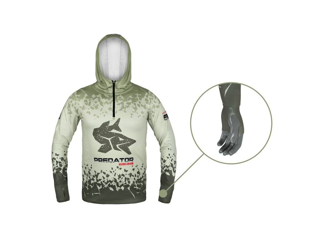 Pro příznivce lovu dravých ryb je zde triko s kapucí Delphin UV ARMOR 50+ Predator poskytující důkladnou ochranu před přímým slunečním zářením během letních dnů. Použitá látka s ochranou UPF 50+ zabrání spálení citlivé pokožky a zároveň na dotek příjemně chladí i během nejteplejších dnů. Mysleli jsme také na nejpřehřívanější část těla, hlavu. Triko je vybaveno výrazně vyvýšeným límcem a kapucí, ale také prodlouženými rukávy s otvory na palec, což zvyšuje ochranu rukou. Velkou výhodou příjemného, elastického materiálu je schopnost rychlého vyschnutí v případě namočení během lovu. Samotné tričko je vysoké kvality, stejně jako použitý barevný potisk. Nabízíme je v široké škále velikostí od S až XXXL. Designově je tričko laděno do světle zelené barvy s tmavě zelenou grafikou a s originálním motivem útočící štiky. Složení: 90% polyester, 10% elastanDoplňkové parametry