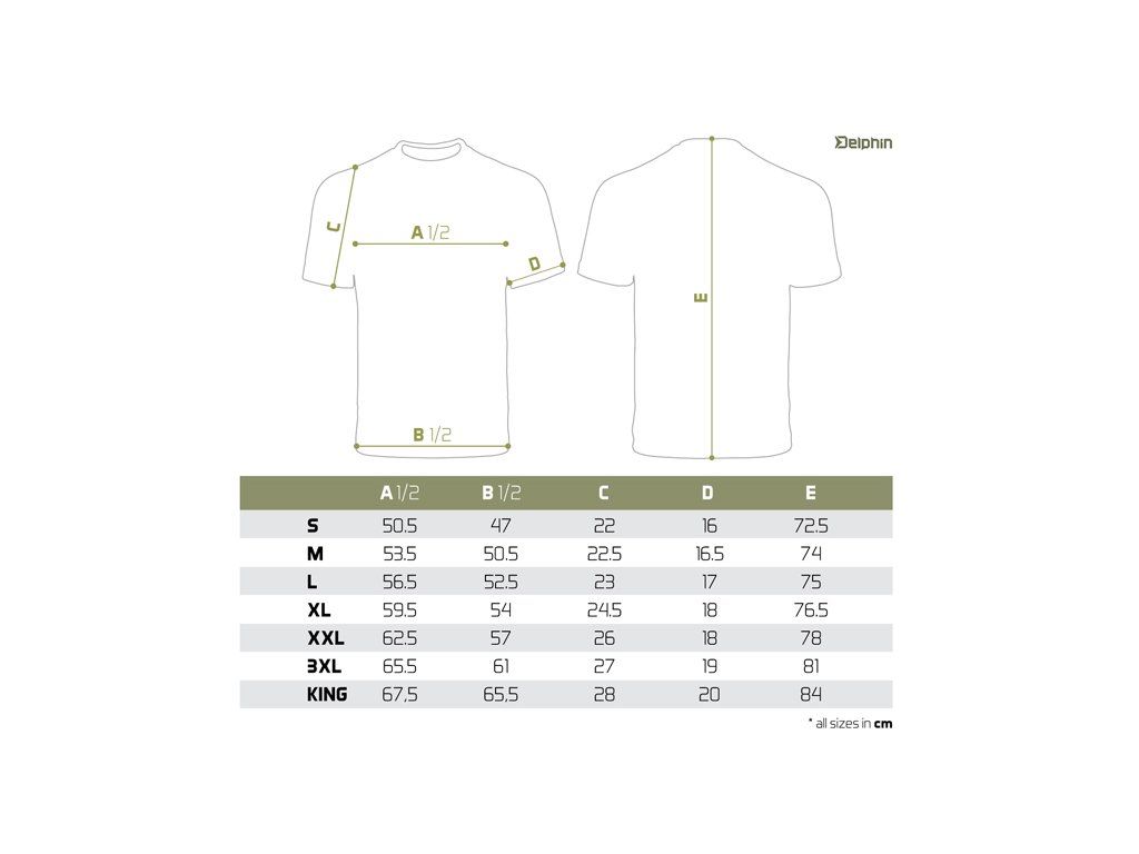 Stylové triko Delphin LOGOS, které s oblibou využijete při vycházkách k vodě ale i při každodenním nošení. K jeho výrobě byl použit pohodlný bavlněný materiál olivově zelené barvy, čímž dokonale splyne s okolní přírodou. Hlavním znakem řady oblečení LOGOS je velké logo značky Delphin, umístěné na hrudi. Logo se skládá z menších nápisů Delphin, které vytváří efektní mozaiku ve tvaru našeho loga. Použité materiály jsou příjemné na dotek a zaručují komfort při nošení. Samotné tričko je vysoké kvality, stejně jako použitý barevný tisk. Nabízíme je v široké škále velikostí od S až po KING SIZE (ekvivalent 4+XL, který je ve většině zemí označován jako XXXXXL). Model King size tedy hravě oblékne i ty nejstatnější rybáře o hmotnosti 135kg+. Složení: 100% bavlnaDoplňkové parametry