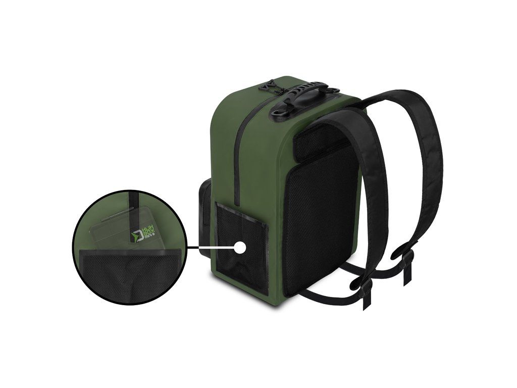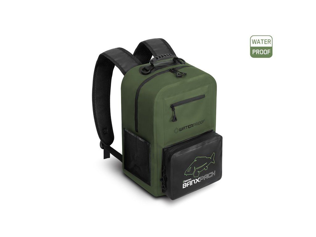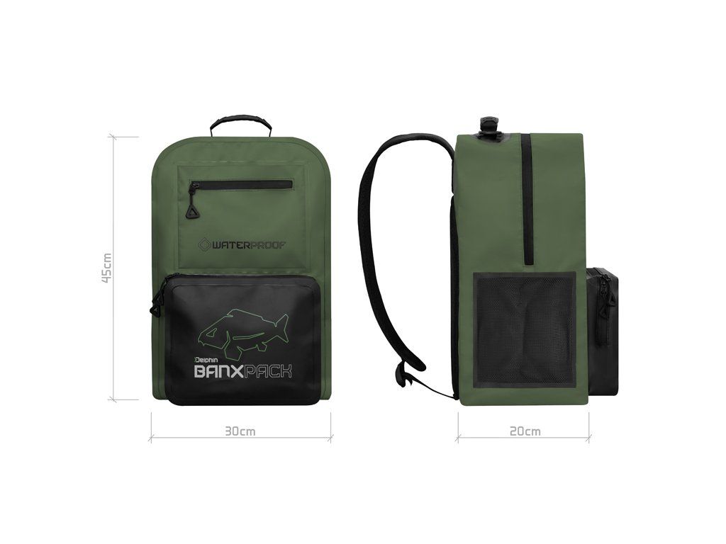 Delphin BanxPACK XL je voděodolný batoh, který spolehlivě ochrání uložené oblečení nebo rybářské náčiní před nepříznivým počasím i vydatnými dešťovými srážkami. Je vyroben z voděodolného EVA materiálu, který je zároveň snadný pro údržbu. To znamená, že v případě zašpinění stačí povrch přetřít hadříkem a za pár minut je suchý. Pokud se vám uvnitř vylije tekutina nebo atraktor, jednoduše ji vylijete a vnitřek snadno vyčistíte. Batoh nabízí prostorný hlavní úložný prostor, který doplňují praktické boční a přední kapsy. Díky velkému objemu do něj bez problémů uložíte boxy různých velikostí, oblečení či jiného vybavení, které chcete udržet v suchu. Po bocích se nacházejí kapsy vhodné například na láhev s vodou nebo vidličky. Na přední straně najdete dvě kapsy – menší na rybářské doklady, klíče nebo peněženku a větší, ideální pro uložení menšího organizéru. Všechny kapsy jsou opatřeny voděodolnými zipy s kvalitními běžci, které zaručují, že vaše vybavení zůstane v suchu. Pohodlí a komfort při transportu umocňují nastavitelné ramenní popruhy spolu s měkčenou výztuhou zad. Pro snadný úchop je na vrchní straně pogumované držadlo a po bocích jsou dvě plastová oka, za která si můžete připnout karabinu například s podběrákem. Decentní zeleno černý design doplňují funkční prvky jako taháčky na běžcích zipu nebo designové detaily, jako je například logo s originálním motivem kapra – OutLine. Přestože OutLine logo potěší spoustu kaprařů, své využití nepochybně najde napříč všemi rybolovnými technikami, ale i při jiných outdoorových aktivitách. Technické parametry: Objem: 27L Rozměry: 45x30x20cm Rozměr přední kapsy: 25x20x5cmDoplňkové parametry